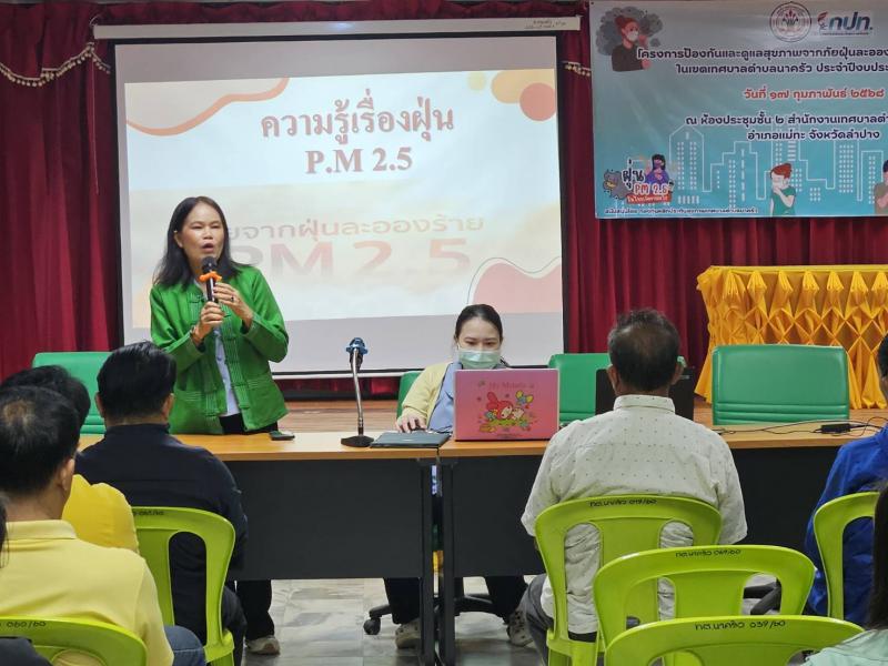 ทั้งนี้เพื่อให้ประชาชนในพื้นที่มีความรู้ในเรื่องการดูแลสุขภาพตนเอง และสามารถป้องกันตนเองจากอันตรายของฝุ่นละอองขนาดเล็ก PM2.5 ณ ห้องประชุมชั้น 2 เทศบาลตำบลนาครัว อำเภอแม่ทะ จังหวัดลำปาง