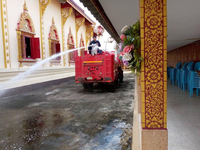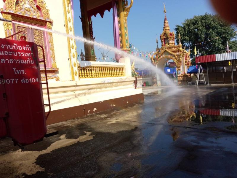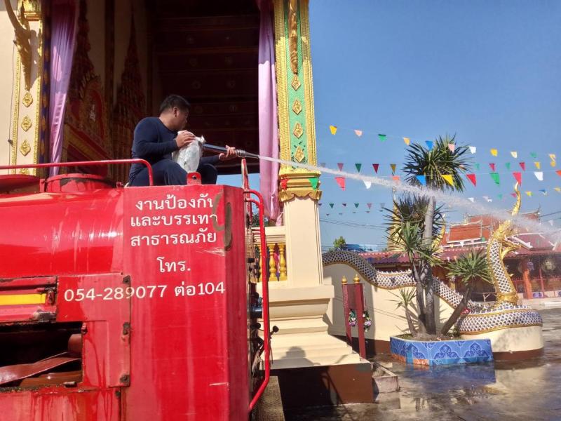 งานป้องกันและบรรเทาสาธารณภัย นำรถบรรทุกน้ำสนับสนุนในการล้างทำความสะอาดบริเวณโดยรอบวิหาร วัดบ้านหลุก
