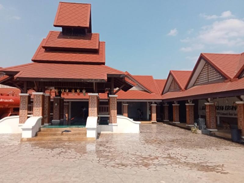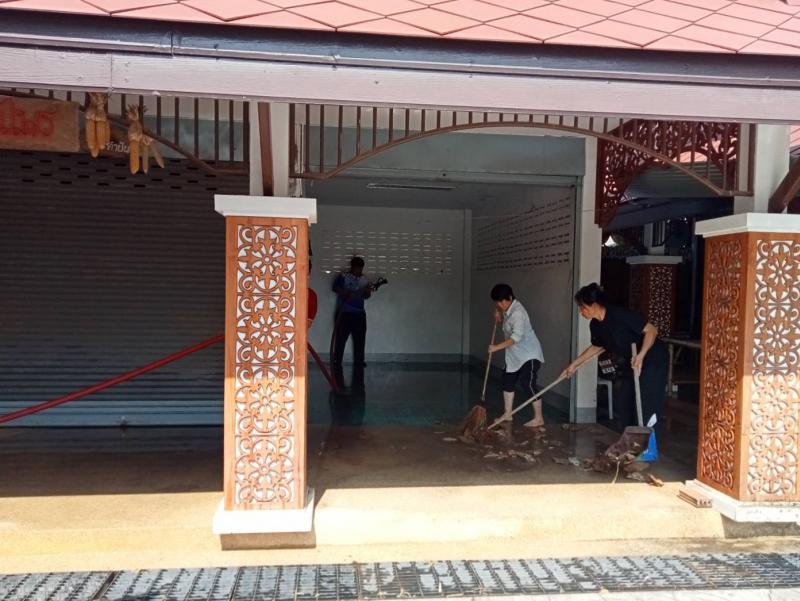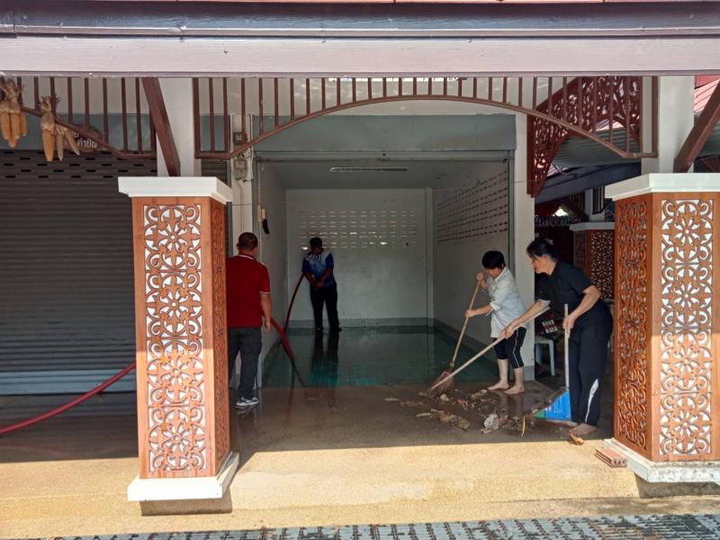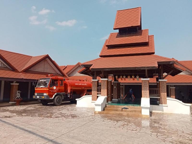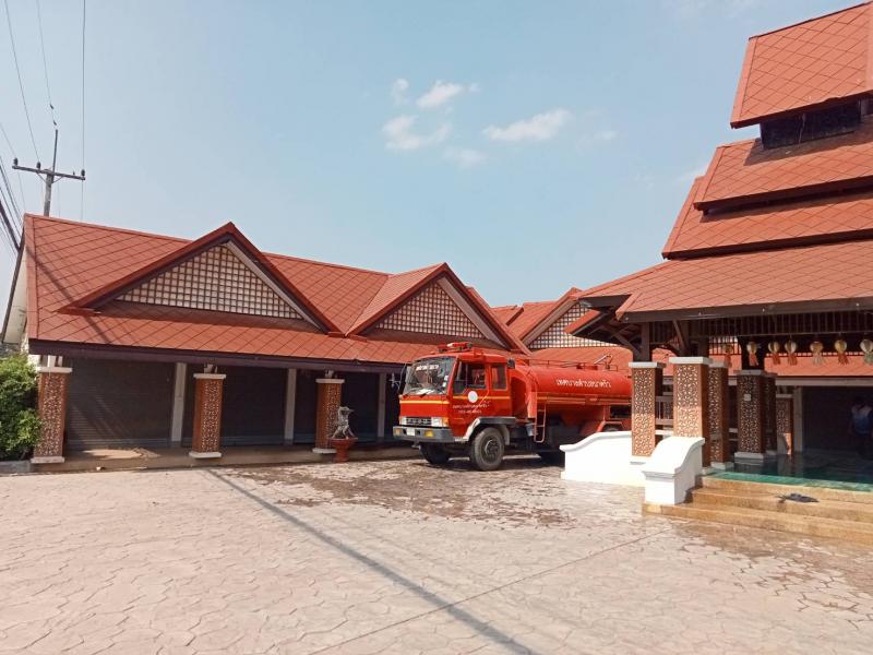 งานป้องกันฯ นำรถบรรทุกน้ำสนับสนุนในการฉีดน้ำแรงดันสูงทำความสะอาดศูนย์แสดงหัตถกรรมไม้แกะสลักบ้านหลุก