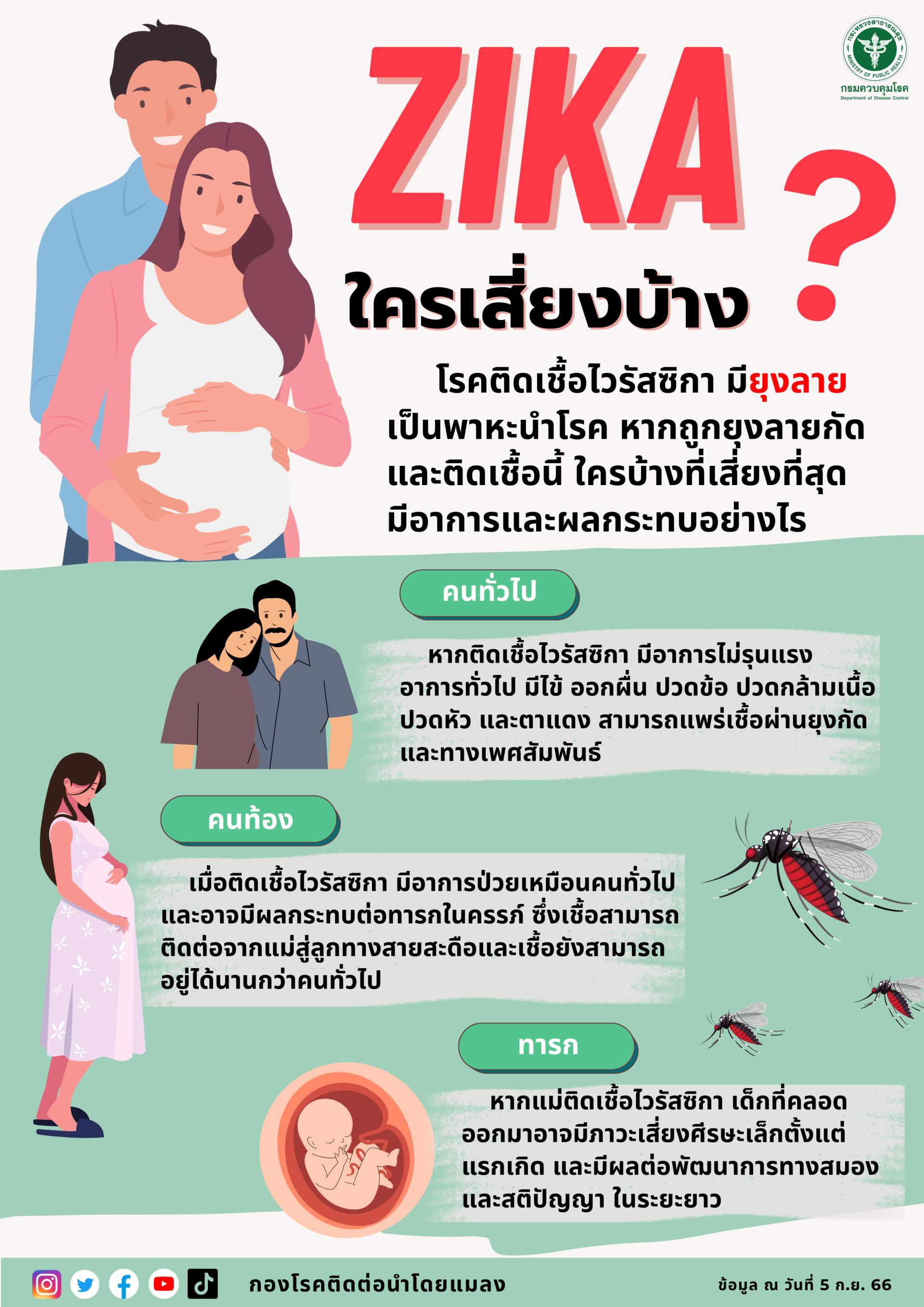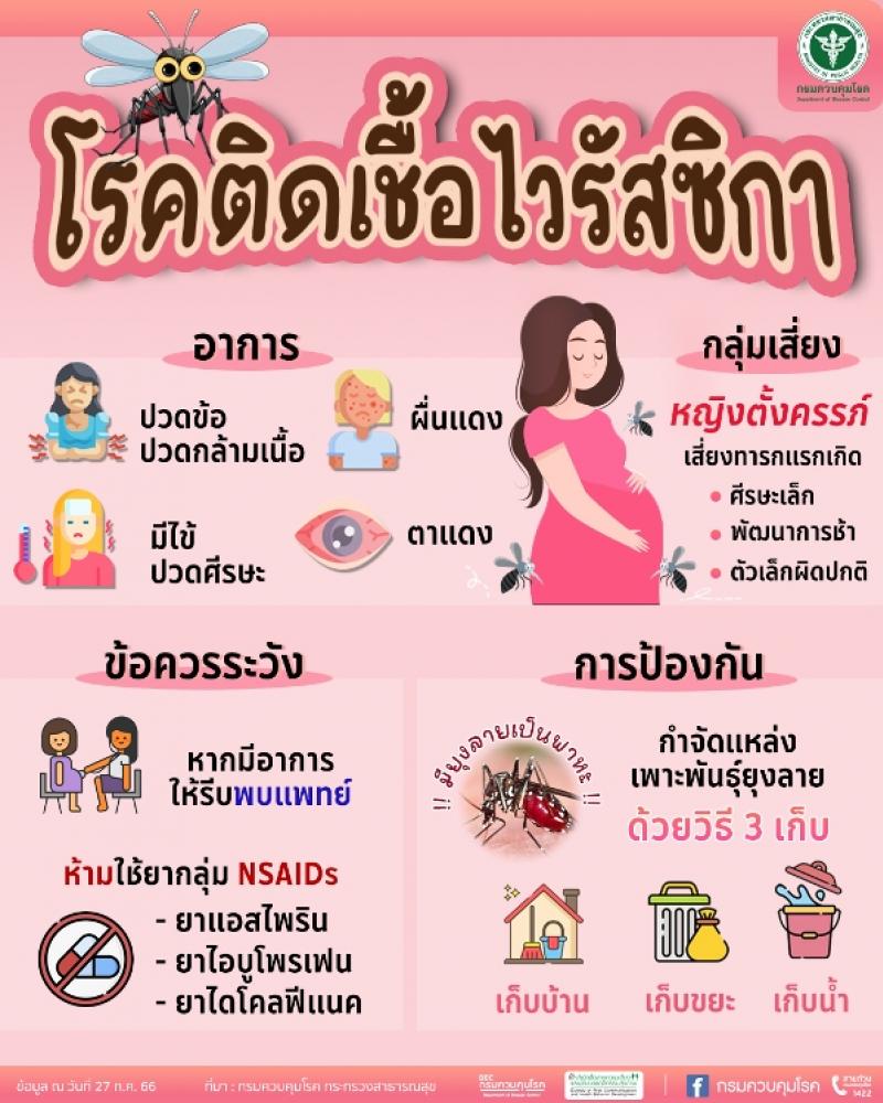 รายละเอียด : แจ้งเตือนสถานการณ์โรคติดเชื้อไวรัสซิกา และโรคไข้เลือดออก ในกลุ่มหญิงตั้งครรภ์ เนื่องจากสถานการณ์ปัจจุบันมีแนวโน้มผู้ป่วยโรคติดเชื้อไวรัสซิกาและการติดเชื้อไวรัสเดงกี ในกลุ่มหญิงตั้งครรภ์อย่างต่อเนื่อง เพื่อเป็นการเฝ้าระวังและลดความเสี่ยงจากโรคที่เกิดจากยุงลาย ขอแนะนำให้ประชาชนป้องกันดูแลตนเองไม่ให้ถูกยุงกัด และกำจัดแหล่งเพาะพันธุ์ยุงลายในบ้านเรือน และชุมชน