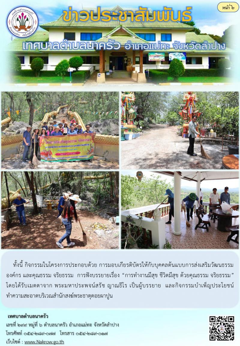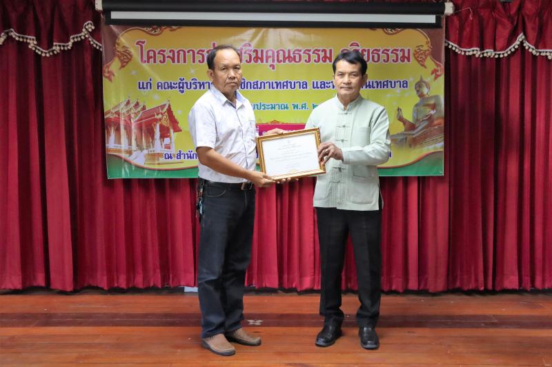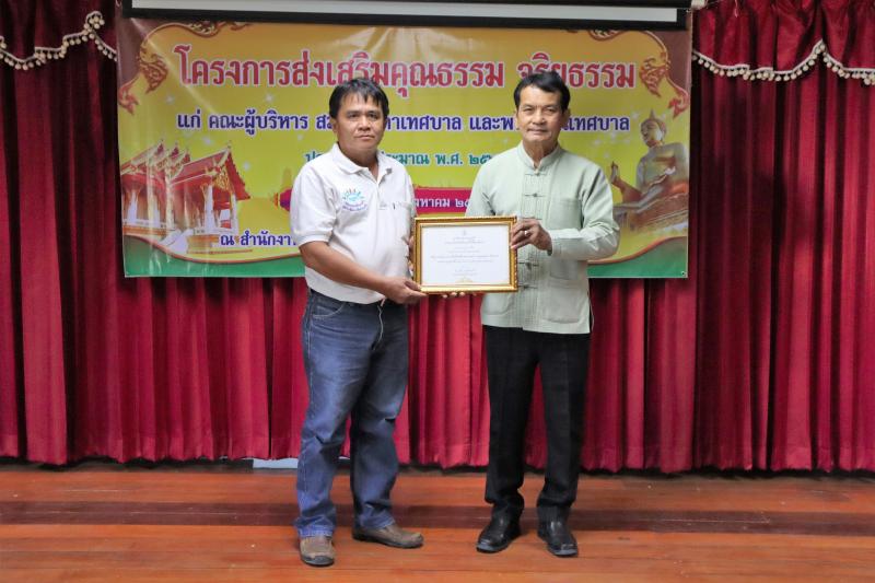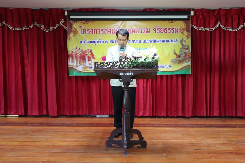 รายละเอียด : วันที่ 18 สิงหาคม 2566 นายทวี สารใจวงศ์ นายกเทศมนตรีตำบลนาครัว เป็นประธานเปิดโครงการฝึกอบรมคุณธรรม จริยธรรม แก่ผู้บริหาร สมาชิกสภา และพนักงานเทศบาลตำบลนาครัว ในการจัดโครงการครั้งนี้มีวัตถุประสงค์เพื่อให้ผู้รับการอบรมมีหลักการ และแนวทางปฏิบัติในการเสริมสร้างให้เป็นคนดี มีคุณธรรม พัฒนาคุณภาพชีวิตสังคม นำไปสู่การพัฒนาการทำงานที่ซื่อสัตย์ สุจริต โดยนำหลักของพระพุทธศาสนามาใช้ในการปฏิบัติงานให้เป็นผู้พัฒนาตนเอง พัฒนาทีมงาน และนำไปสู่การพัฒนาองค์กร ทั้งนี้ กิจกรรมในโครงการประกอบด้วย การมอบเกียรติบัตรให้กับบุคคลต้นแบบการส่งเสริมวัฒนธรรมองค์กร และคุณธรรม จริยธรรม การฟังบรรยายเรื่อง “การทำงานมีสุข ชีวิตมีสุข ด้วยคุณธรรม จริยธรรม” โดยได้รับเมตตาจาก พระมหาประพจน์สรัช ญาณธีโร เป็นผู้บรรยาย และกิจกรรมบำเพ็ญประโยชน์ ทำความสะอาดบริเวณสำนักสงฆ์พระธาตุดอยผาปูน