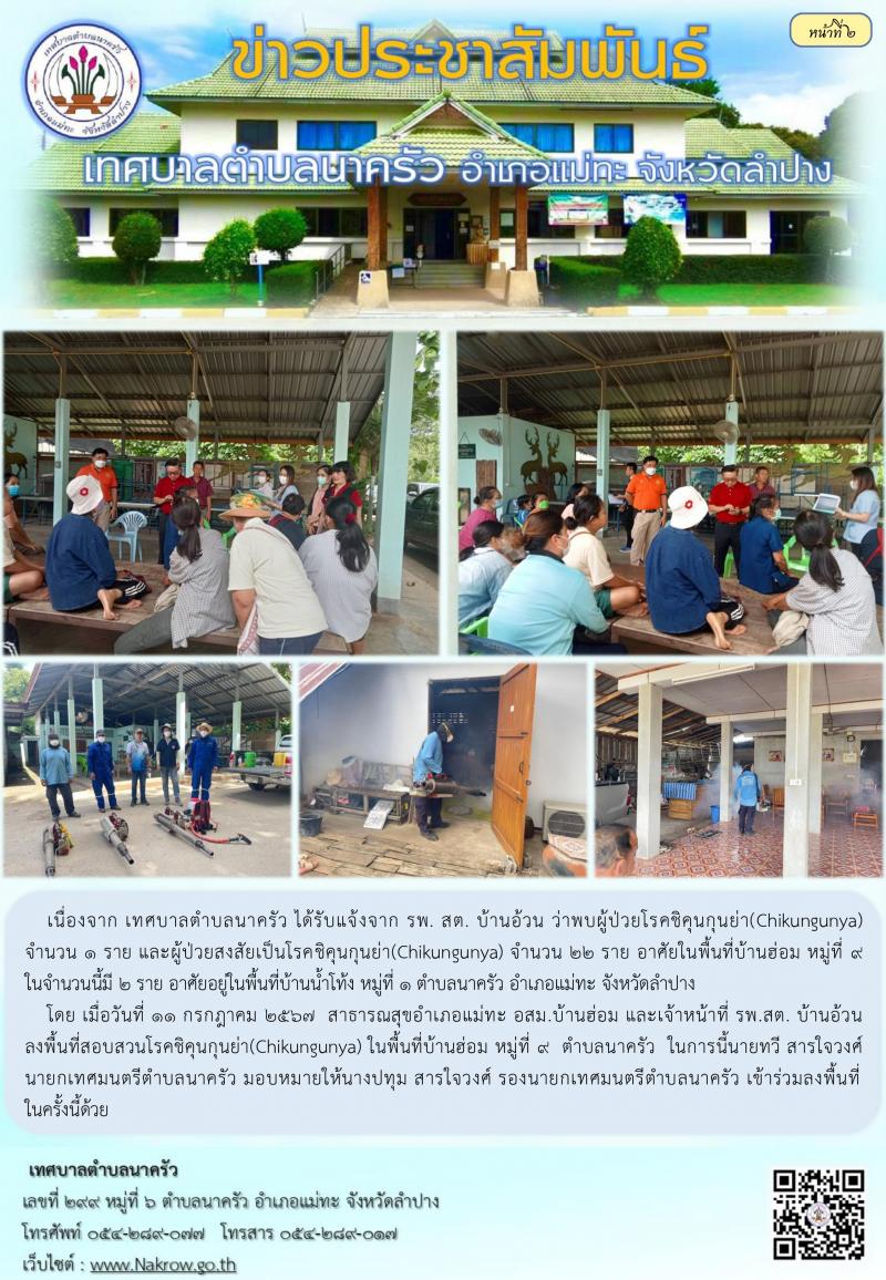 เทศบาลตำบลนาครัวลงพื้นที่พ่นสารเคมีกำจัดยุงตัวแก่เพื่อป้องกันและควบคุมการแพร่ระบาดของโรคชิคุนกุนย่า(Chikungunya) ในพื้นที่บ้านฮ่อม หมู่ที่9 และบ้านน้ำโท้ง หมู่ที่ 1