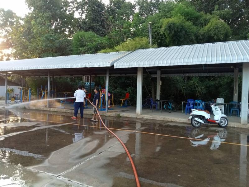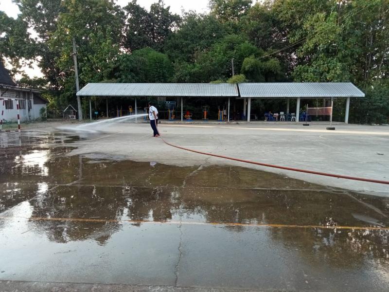 งานป้องกันและบรรเทาสาธารณภัย นำรถบรรทุกน้ำสนับสนุนในการฉีดน้ำทำความสะอาดฝุ่นละออง และเศษข้าวเปลือก บริเวณลานกีฬาต้านยาเสพติด บ้านหลวง หมู่ที่ 2