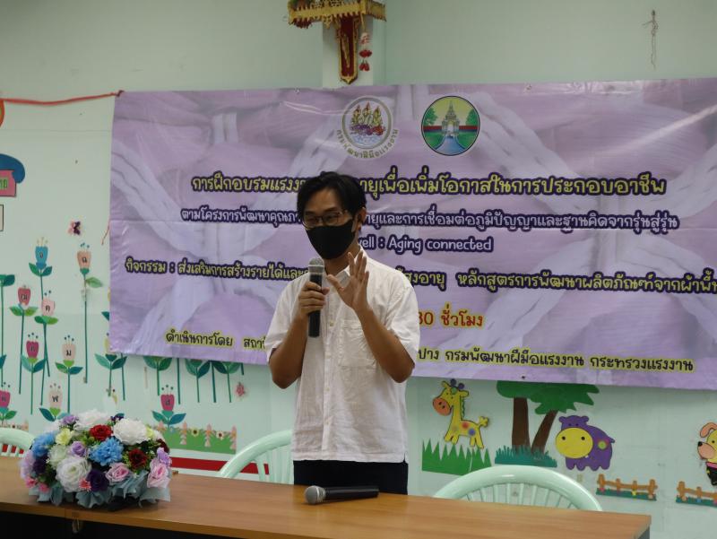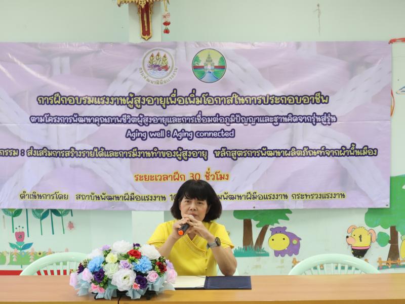นางปทุม สารใจวงศ์ รองนายกเทศมนตรีตำบลนาครัว เปิดการฝึกอบรมโครงการพัฒนาคุณภาพชีวิตผู้สูงอายุและการเชื่อมต่อภูมิปัญญาและฐานคิดจากรุ่นสู่รุ่น Aging well : connected (หลักสูตร : การพัฒนาผลิตภัณฑ์จากผ้าพื้นเมือง)