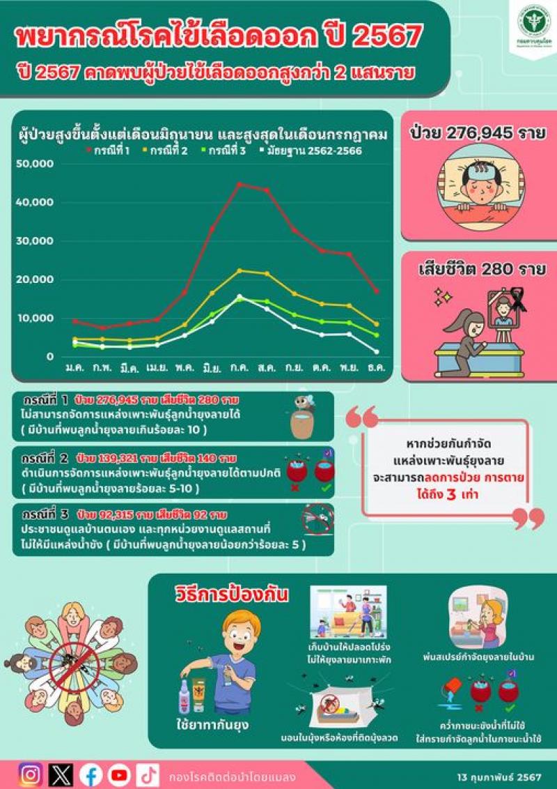 “เดิมผู้ป่วยไข้เลือดออกแล้วเสียชีวิตจะพบมากในกลุ่มเด็ก แต่ปัจจุบันพบว่าผู้เสียชีวิตสูงสุดเป็นกลุ่มผู้ใหญ่ที่มีโรคประจำตัว ทำให้ขณะนี้โรคไข้เลือดออกเป็นโรคของทุกกลุ่มวัยแล้ว โดยการติดเชื้อครั้งแรกอาการอาจจะไม่มาก แต่ถ้ามีการติดเชื้อซ้ำจะมีความรุนแรงสูงมาก ส่วนสาเหตุที่มีการติดเชื้อซ้ำได้เพราะ ไข้เลือดออกมีถึง 4 สายพันธุ์ ดังนั้นใน 1 ชีวิตเราสามารถติดได้ถึง 4 ครั้ง อย่างไรก็ตาม ขณะนี้กรมควบคุมโรคเฝ้าระวังโรคไข้เลือดออกทุกพื้นที่ ซึ่งในปีก่อนอาจมีการเฝ้าระวังบางจังหวัดที่พบผู้ป่วยเยอะ แต่เราคาดว่าปีนี้จะพบได้ทั้งหมด เสี่ยงได้ทุกกลุ่ม จึงต้องขอให้ประชาชนระมัดระวังและปฏิบัติตามคำแนะนำ