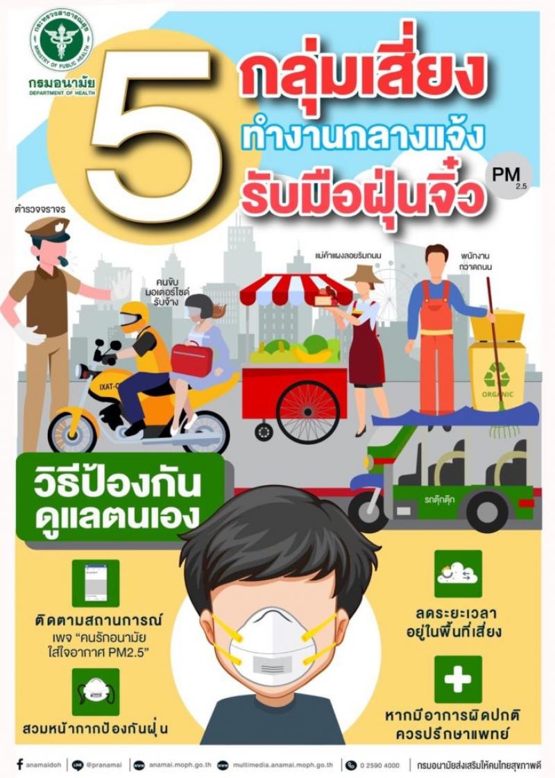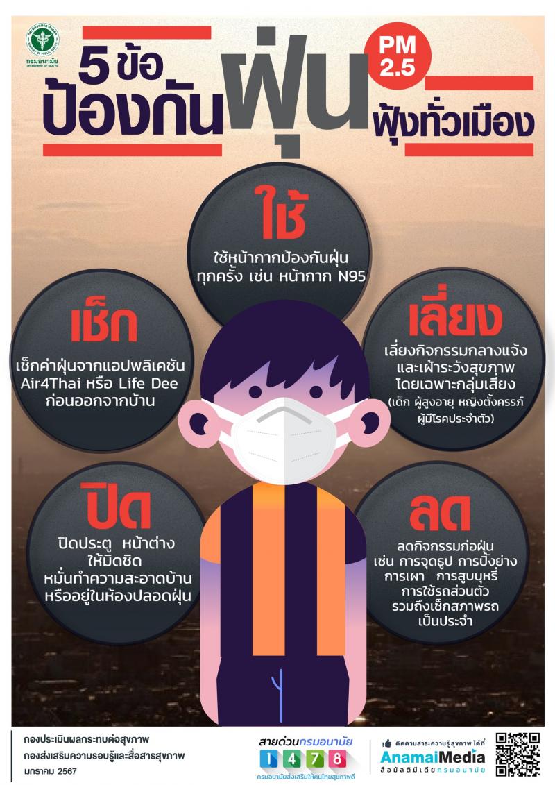 รายละเอียด : ฝุ่น PM2.5 เป็นอันตรายต่อสุขภาพ เพราะสามารถเดินทางผ่านทางเดินหายใจสู่ปอดและกระแสเลือดได้ง่าย เพิ่มโอกาสของโรคหัวใจและโรคเกี่ยวกับทางเดินหายใจ และต้องป้องกันด้วยการสวมใส่หน้ากากอนามัยที่ได้มาตรฐานป้องกันฝุ่นขนาดเล็กโดยเฉพาะ