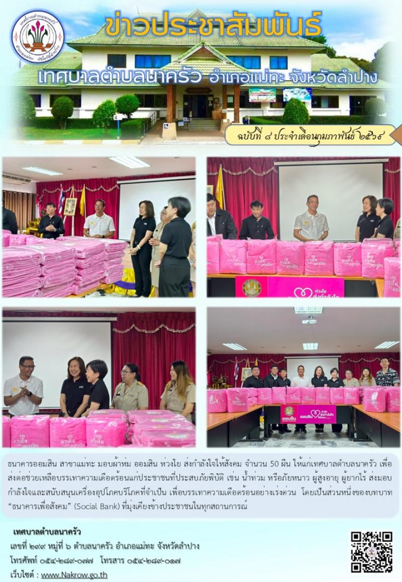 ธนาคารออมสิน สาขาแม่ทะ มอบผ้าห่ม ออมสิน ห่วงใย ส่งกำลังใจให้สังคม จำนวน 50 ผืน ให้แก่เทศบาลตำบลนาครัว เพื่อส่งต่อช่วยเหลือบรรเทาความเดือดร้อนแก่ประชาชนที่ประสบภัยพิบัติ เช่น น้ำท่วม หรือภัยหนาว ผู้สูงอายุ ผู้ยากไร้ ส่งมอบกำลังใจและสนับสนุนเครื่องอุปโภคบริโภคที่จำเป็น เพื่อบรรเทาความเดือดร้อนอย่างเร่งด่วน โดยเป็นส่วนหนึ่งของบทบาท “ธนาคารเพื่อสังคม” (Social Bank) ที่มุ่งเคียงข้างประชาชนในทุกสถานการณ์