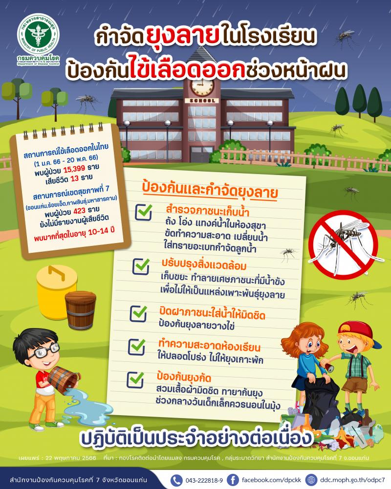 รายละเอียด : กรมควบคุมโรค จึงขอแนะนำประชาชน ให้ดำเนินการป้องกันโรคส่วนบุคคลได้แก่ นอนในมุ้งหรืออยู่ในห้องติดมุ้งลวด ใส่เสื้อผ้ามิดชิด ทาโลชั่นกันยุงที่มีองค์ประกอบของ DEET ความเข้มข้นในเด็กและผู้ใหญ่ที่แนะนำ คือ 20-30% และ 20-50% และปฏิบัติตามมาตรการ “3 เก็บ ป้องกัน 3 โรค” ได้แก่ เก็บบ้าน ให้ปลอดโปร่งไม่ให้ยุงลายเกาะพัก จัดเก็บเสื้อผ้าใส่ตู้ให้เป็นระเบียบ เก็บขยะ เศษภาชนะไม่ให้เป็นแหล่งเพาะพันธุ์ เช่น กะลา กระป๋อง ถุงพลาสติก ควรเก็บทิ้งหรือถม ยางรถยนต์เก่าสามารถดัดแปลงนำมาใช้ประโยชน์หรือขายให้สถานประกอบการ เก็บแหล่งน้ำ ปิดให้มิดชิด เปลี่ยนถ่ายน้ำทุกสัปดาห์ไม่ให้ยุงลายวางไข่ ภาชนะขังน้ำขนาดเล็กหมั่นเปลี่ยนน้ำทุก 7 วัน เช่น แจกันดอกไม้สด แจกันหิ้งบูชาพระ แจกันที่ศาลพระภูมิ ขวดเลี้ยงพลูด่าง ไม้ประดับ ใส่ทรายธรรมดาในจานรองกระถางต้นไม้ให้ดูดซับน้ำ จะสามารถป้องกันได้ 3 โรค คือ