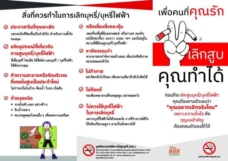 รายละเอียด : สืบเนื่องจากองค์การอนามัยโลกได้กำหนดประเด็นรณรงค์วันงดสูบบุหรี่โลก ประจำปี 2564 ว่า "COMMIT TO QUIT" โดยมีการตั้งเป้าให้นักสูบอย่างน้อย 100 ล้านคนทั่วโลกสามารถเลิกสูบบุหรี่ได้ในปี 2564 นี้ สำหรับประเทศไทยได้กำหนดคำขวัญเป็นภาษาไทยว่า "เลิกสูบ ลดเสี่ยง คุณทำได้" นั่นก็เพราะว่า ปัจจุบันนานาประเทศประสบปัญหาการระบาดของโรคติดเชื้อไวรัสโคโรนา 2019 (COVID-19) ซึ่งเชื้อจะทำลายปอด ทำให้ปอดอักเสบรุนแรงการสูบบุหรี่ จึงเป็นสาเหตุหลักที่ทำลายปอดและเพิ่มโอกาสเสี่ยงในการติดเชื้อไวรัส ส่งผลให้อาการของผู้ติดเชื้อไวรัส COVID-19 ทรุดหนักได้