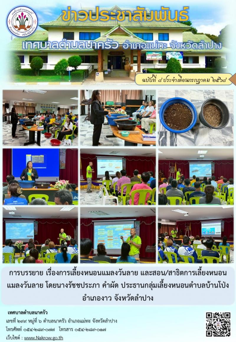 3.การบรรยาย เรื่องการเลี้ยงหนอนแมลงวันลาย และสอน/สาธิตการเลี้ยงหนอนแมลงวันลาย โดยนางรัชชประภา คำผัด ประธานกลุ่มเลี้ยงหนอนตำบลบ้านโป่ง อำเภองาว จังหวัดลำปาง