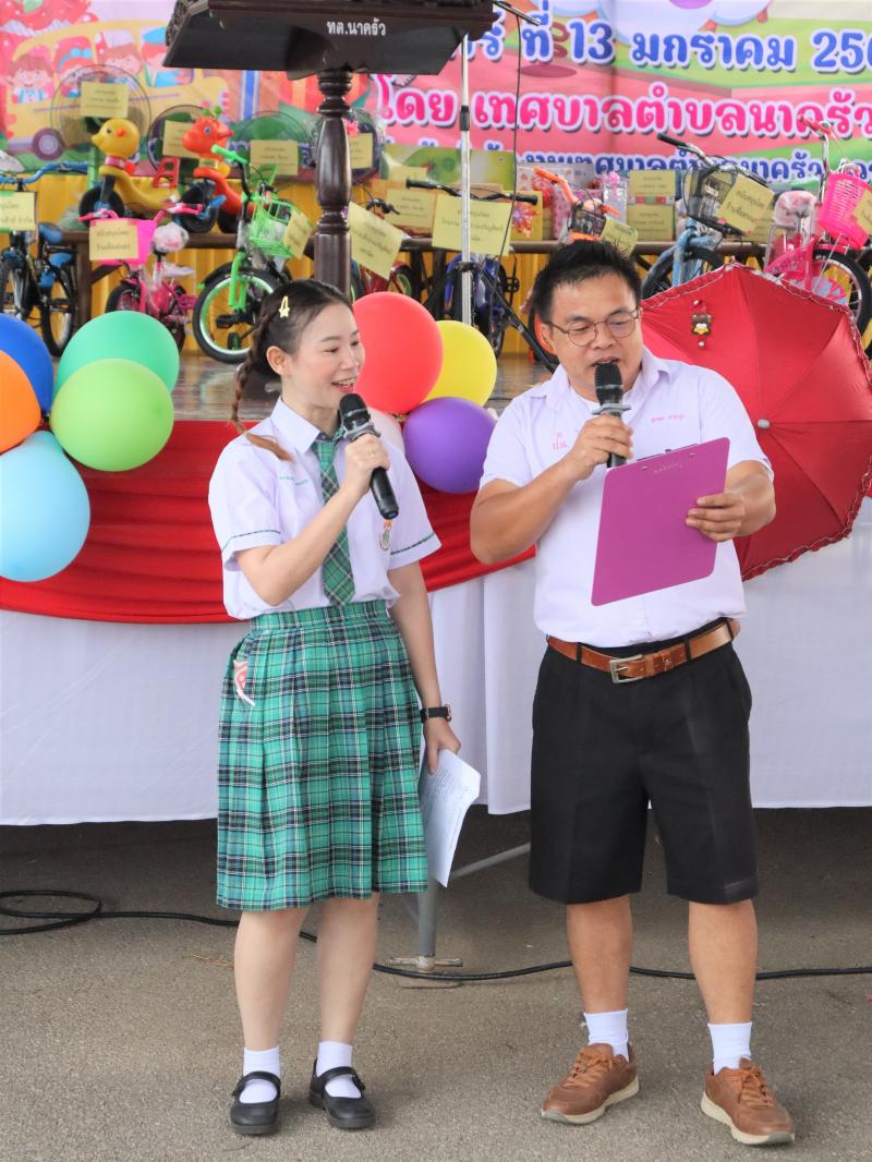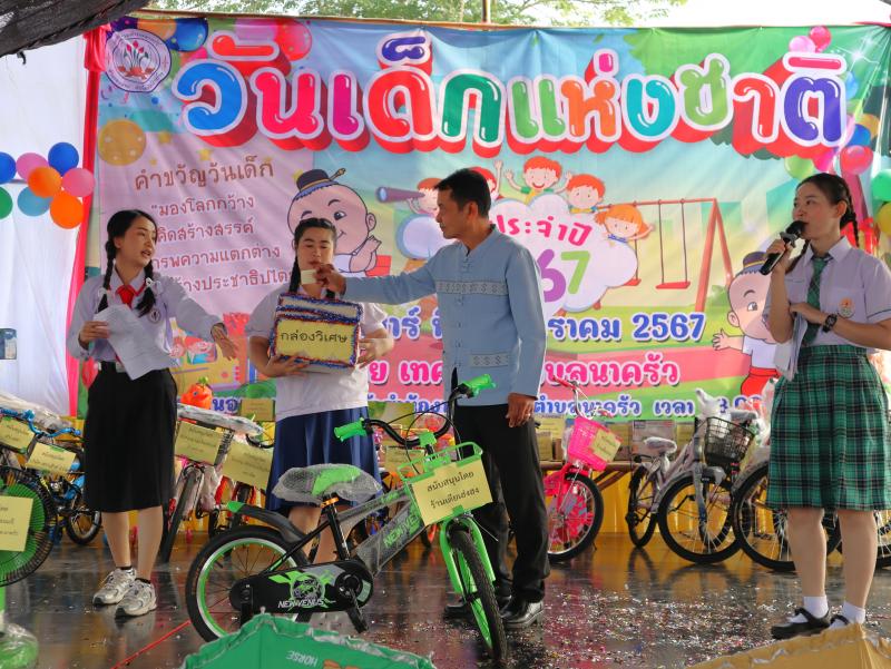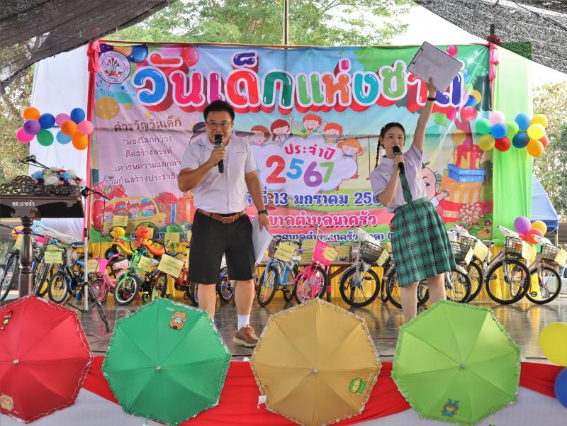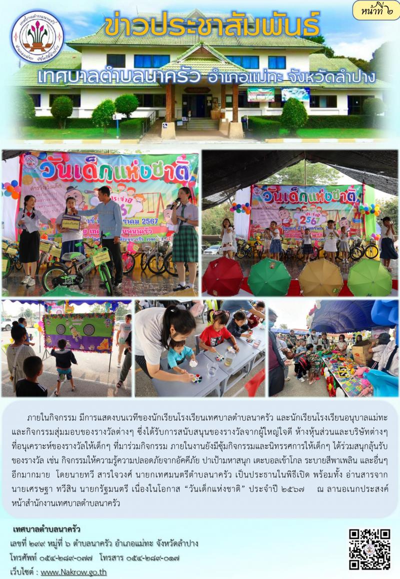 รายละเอียด : วันเสาร์ที่ 13 มกราคม 2567 เทศบาลตำบลนาครัว นำโดยนายทวี สารใจวงศ์ นายกเทศมนตรีตำบลนาครัว พร้อมด้วยคณะผู้บริหารเทศบาล สมาชิกสภาเทศบาล หัวหน้าส่วนราชการ เจ้าหน้าที่เทศบาลตำบลนาครัว และคณะครูโรงเรียนเทศบาลตำบลนาครัว ได้ดำเนินกิจกรรม "วันเด็กแห่งชาติ ประจำปี 2567" ขึ้น โดยมีวัตถุประสงค์เพื่อส่งเสริมให้เด็กและเยาวชนในพื้นที่เทศบาลตำบลนาครัวและพื้นที่ใกล้เคียงมีความสุขทั้งกายใจ อารมณ์ - สังคม มีพัฒนาการที่เหมาะสมตามวัย ครบทั้ง 4 ด้าน และเพื่อให้เด็กได้มีโอกาสกล้าแสดงออก ได้ร่วมกิจกรรมอย่างสนุกสนาน ภายในกิจกรรม มีการแสดงบนเวทีของนักเรียนโรงเรียนเทศบาลตำบลนาครัว และนักเรียนโรงเรียนอนุบาลแม่ทะ และกิจกรรมสุ่มมอบของรางวัลต่างๆ ซึ่งได้รับการสนับสนุนของรางวัลจากผู้ใหญ่ใจดี ห้างหุ้นส่วนและบริษัทต่างๆ ที่อนุเคราะห์ของรางวัลให้เด็กๆ ที่มาร่วมกิจกรรม ภายในงานยังมีซุ้มกิจกรรมและนิทรรศการให้เด็กๆ ได้ร่วมสนุกลุ้นรับของรางวัล เช่น กิจกรรมให้ความรู้ความปลอดภัยจากอัคคีภัย ปาเป้ามหาสนุก เตะบอลเข้าโกล ระบายสีพาเพลิน และอื่นๆอีกมากมาย โดยนายทวี สารใจวงศ์ นายกเทศมนตรีตำบลนาครัว เป็นประธานในพิธีเปิด พร้อมทั้ง อ่านสารจาก นายเศรษฐา ทวีสิน นายกรัฐมนตรี เนื่องในโอกาส “วันเด็กแห่งชาติ” ประจำปี 2567 ณ ลานอเนกประสงค์หน้าสำนักงานเทศบาลตำบลนาครัว