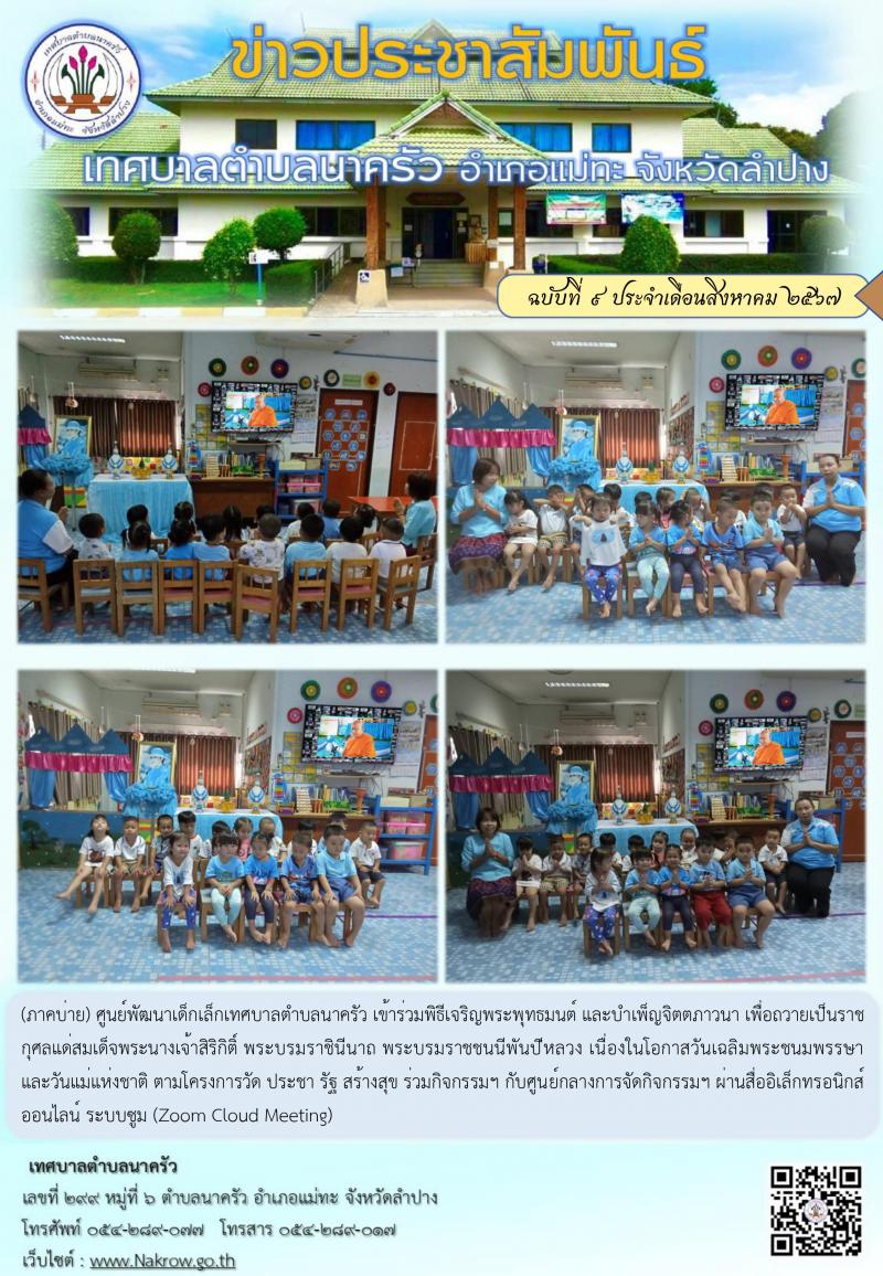 (ภาคบ่าย) ศูนย์พัฒนาเด็กเล็กเทศบาลตำบลนาครัว เข้าร่วมพิธีเจริญพระพุทธมนต์ และบำเพ็ญจิตตภาวนา เพื่อถวายเป็นราชกุศลแด่สมเด็จพระนางเจ้าสิริกิติ์ พระบรมราชินีนาถ พระบรมราชชนนีพันปีหลวง เนื่องในโอกาสวันเฉลิมพระชนมพรรษา และวันแม่แห่งชาติ ตามโครงการวัด ประชา รัฐ สร้างสุข ร่วมกิจกรรมฯ กับศูนย์กลางการจัดกิจกรรมฯ ผ่านสื่ออิเล็กทรอนิกส์ออนไลน์ ระบบซูม (Zoom Cloud Meeting)