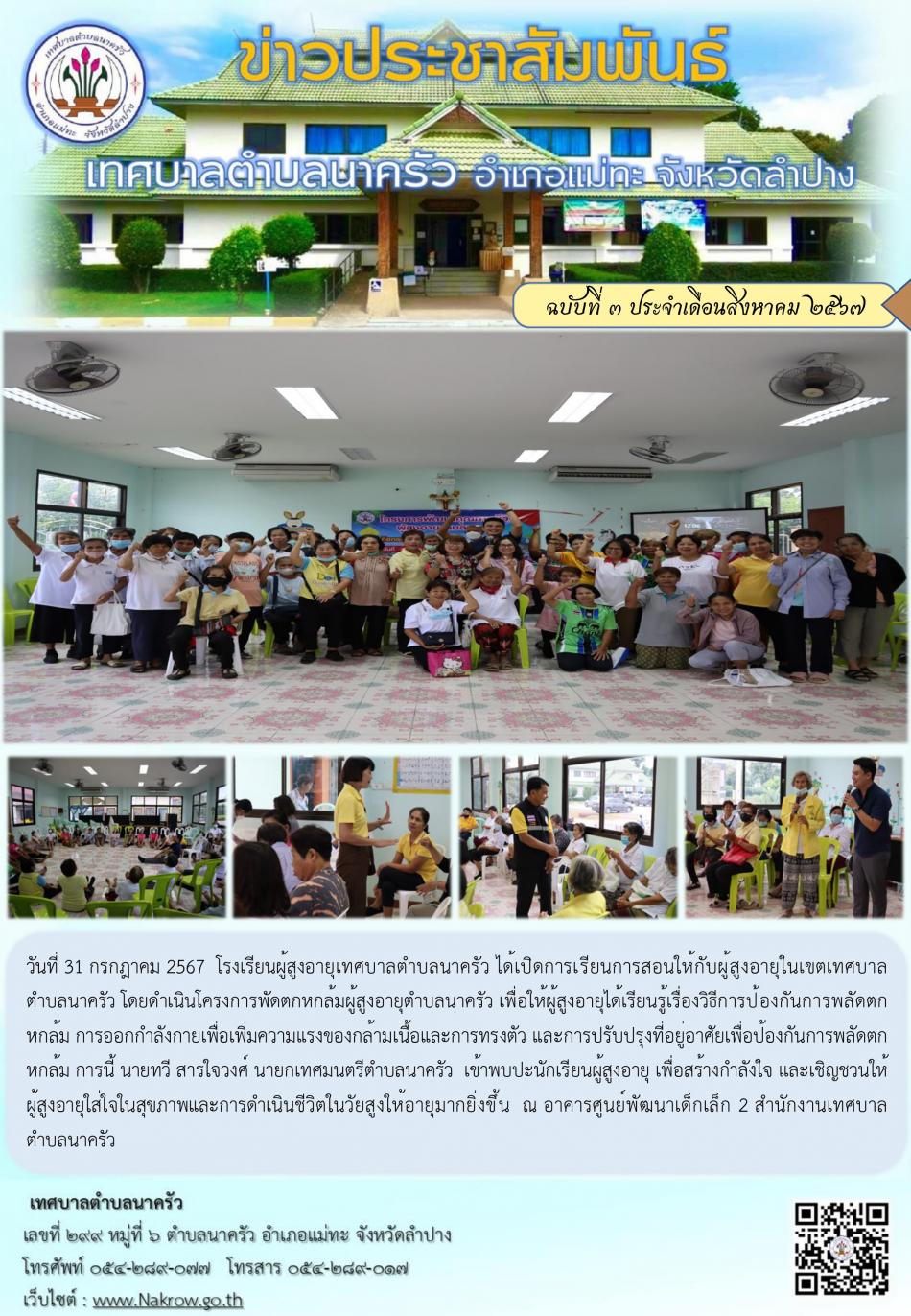 โครงการพัดตกหกล้มผู้สูงอายุตำบลนาครัว เพื่อให้ผู้สูงอายุได้เรียนรู้เรื่องวิธีการป้องกันการพลัดตกหกล้ม การออกกำลังกายเพื่อเพิ่มความแรงของกล้ามเนื้อและการทรงตัว... [6 สิงหาคม 2567]