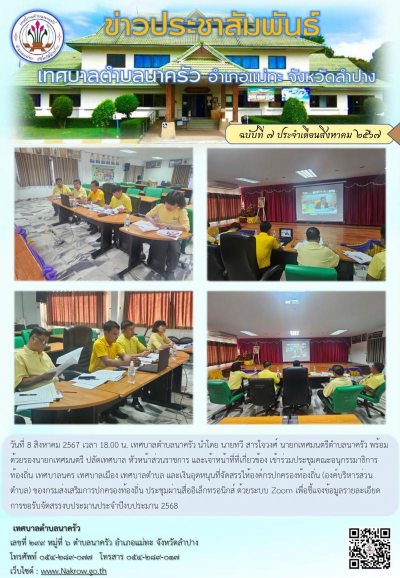 ประชุมคณะอนุกรรมาธิการท้องถิ่น เทศบาลนคร เทศบาลเมือง เทศบาลตำบล และเงินอุดหนุนที่จัดสรรให้องค์กรปกครองท้องถิ่น (องค์บริหารส่วนตำบล) ของกรมส่งเสริมการปกครองท้องถิ่น ประชุมผ่านสื่ออิเล็กทรอนิกส์ ด้วยระบบ Zoom [9 สิงหาคม 2567]