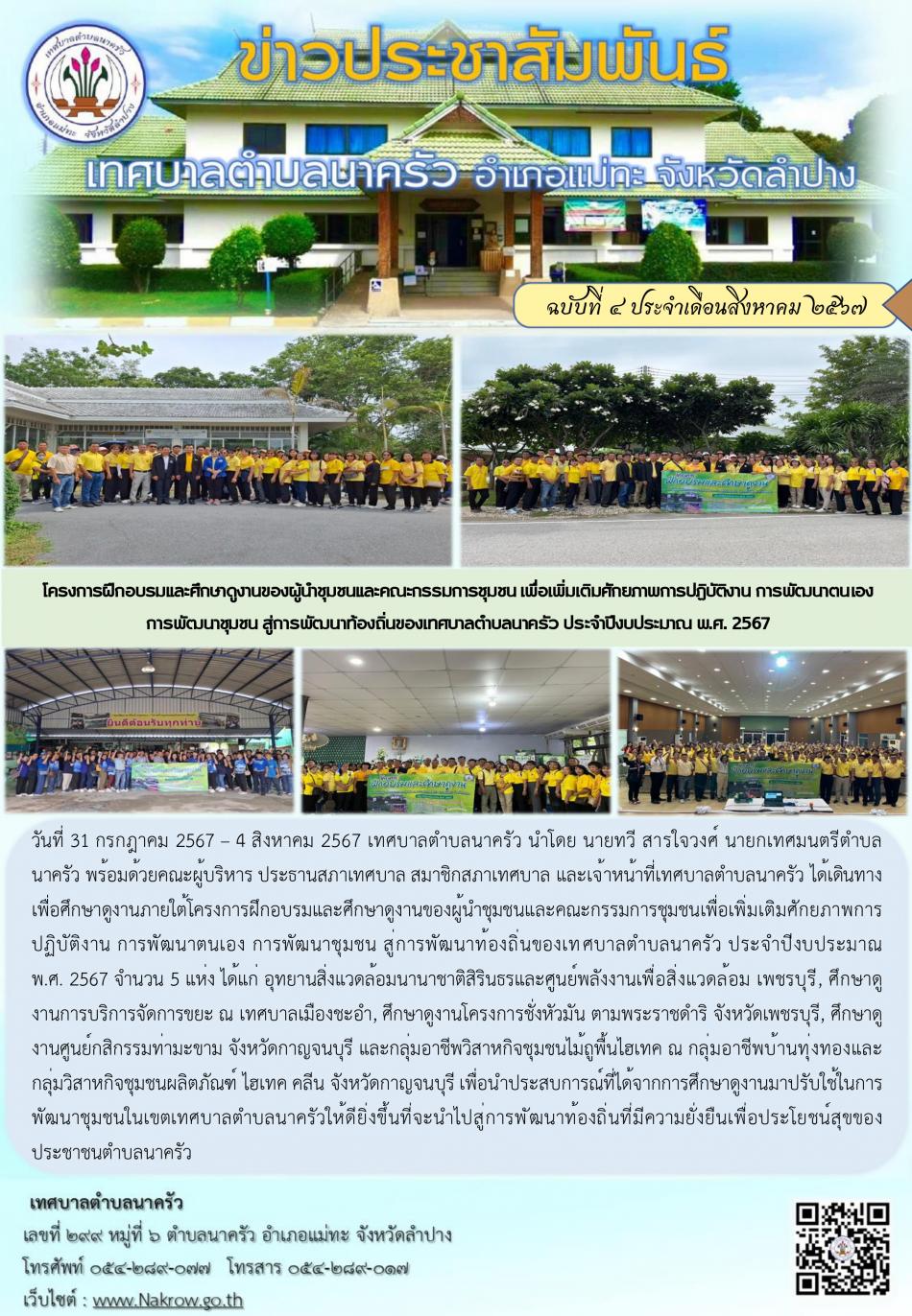 โครงการฝึกอบรมและศึกษาดูงานของผู้นำชุมชนและคณะกรรมการชุมชน เพื่อเพิ่มเติมศักยภาพการปฏิบัติงาน การพัฒนาตนเอง การพัฒนาชุมชน สู่การพัฒนาท้องถิ่นของเทศบาลตำบลนาครัว ประจำปีงบประมาณ พ.ศ. 2567 [6 สิงหาคม 2567]