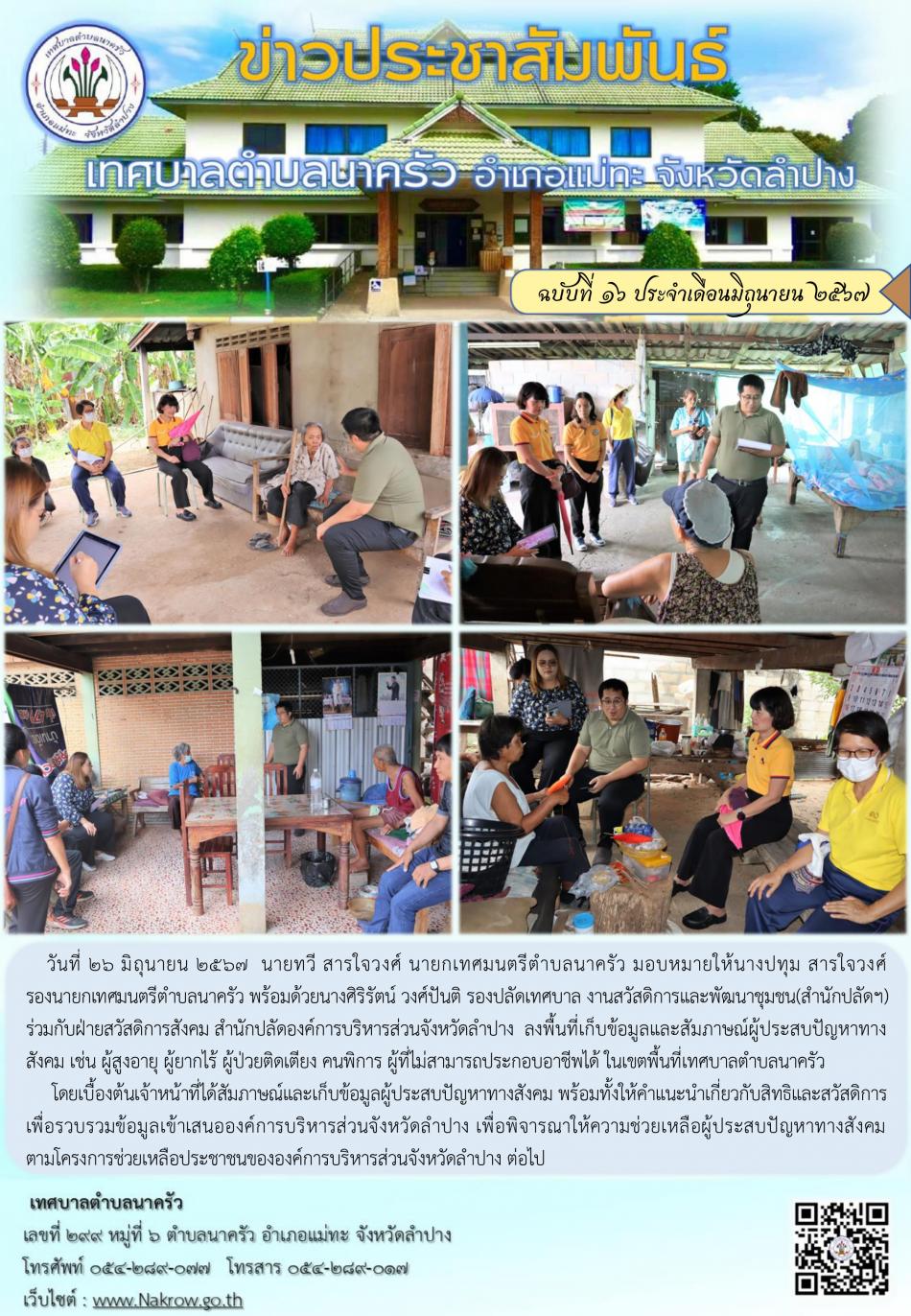 เทศบาลตำบลนาครัวลงพื้นที่ร่วมกับองค์การบริหารส่วนจังหวัดลำปางเก็บข้อมูลและสัมภาษณ์ผู้ประสบปัญหาทางสังคมในเขตพื้นที่เทศบาลตำบลนาครัว [26 มิถุนายน 2567]