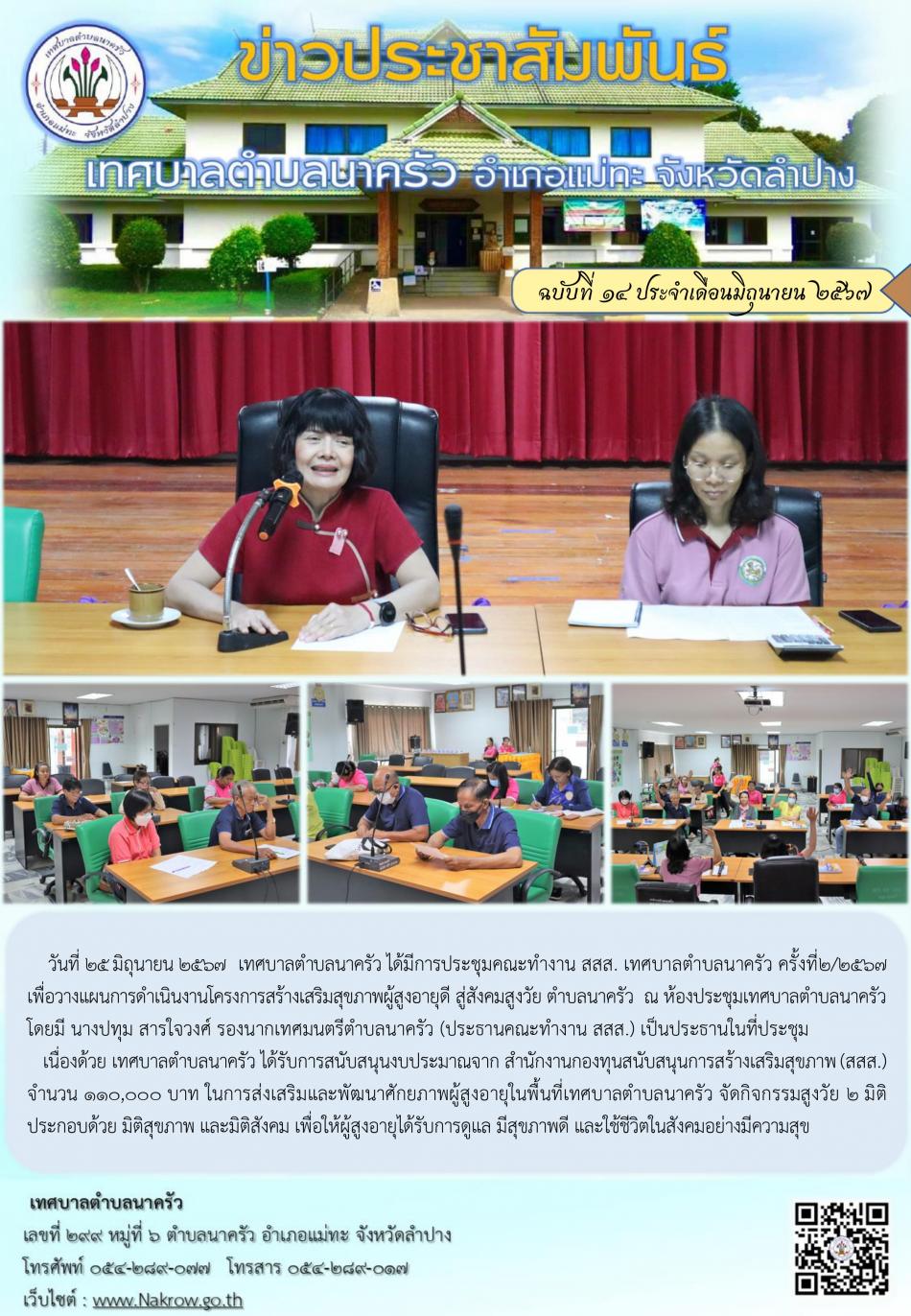ประชุมคณะทำงาน สสส. เทศบาลตำบลนาครัว ครั้งที่ 2/2567 เพื่อวางแผนการดำเนินงานโครงการสร้างเสริมสุขภาพผู้สูงอายุดี สู่สังคมสูงวัย ตำบลนาครัว [25 มิถุนายน 2567]