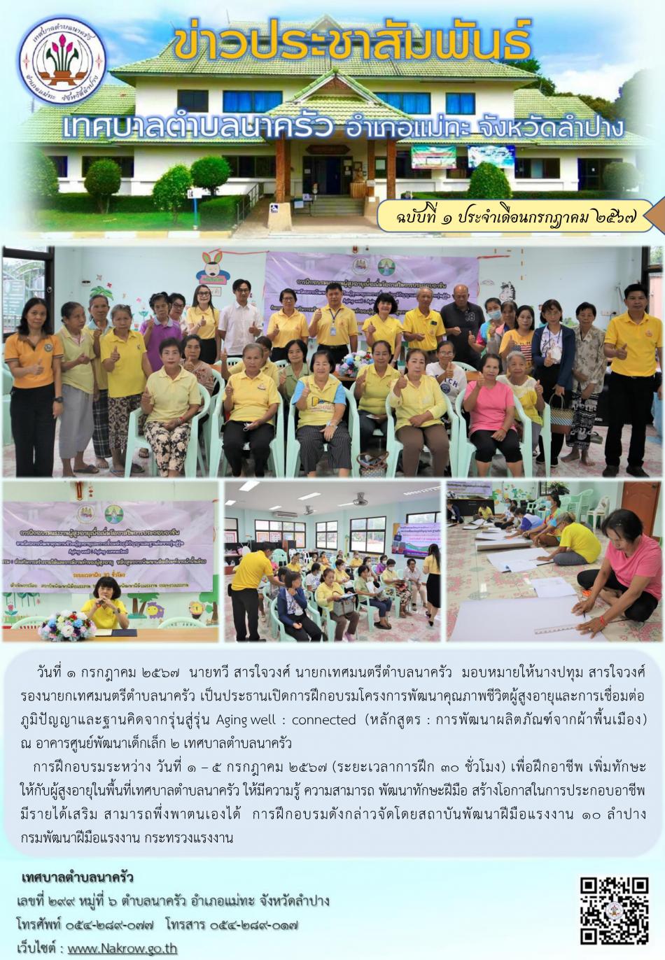 นางปทุม สารใจวงศ์ รองนายกเทศมนตรีตำบลนาครัว เปิดการฝึกอบรมโครงการพัฒนาคุณภาพชีวิตผู้สูงอายุและการเชื่อมต่อภูมิปัญญาและฐานคิดจากรุ่นสู่รุ่น Aging well : connected (หลักสูตร : การพัฒนาผลิตภัณฑ์จากผ้าพื้นเมือง) [1 กรกฎาคม 2567]