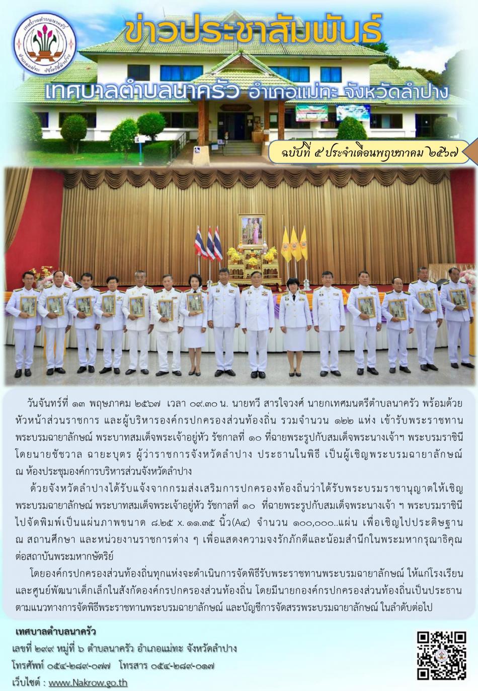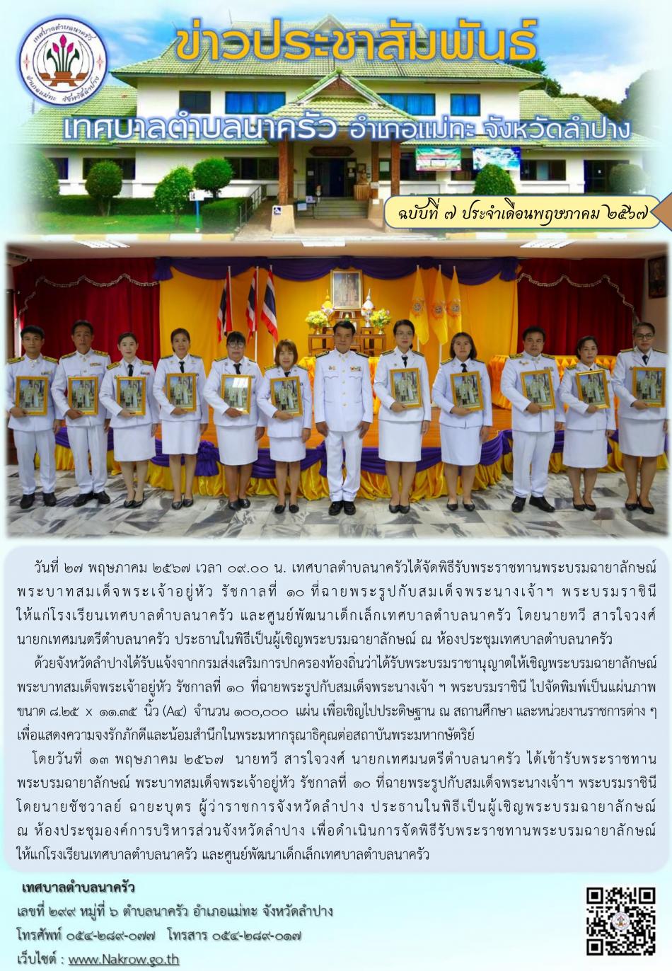 พิธีรับพระราชทานพระบรมฉายาลักษณ์ พระบาทสมเด็จพระเจ้าอยู่หัว รัชกาลที่ 10 ให้แก่โรงเรียนเทศบาลตำบลนาครัว และศูนย์พัฒนาเด็กเล็กเทศบาลตำบลนาครัว [27 พฤษภาคม 2567]