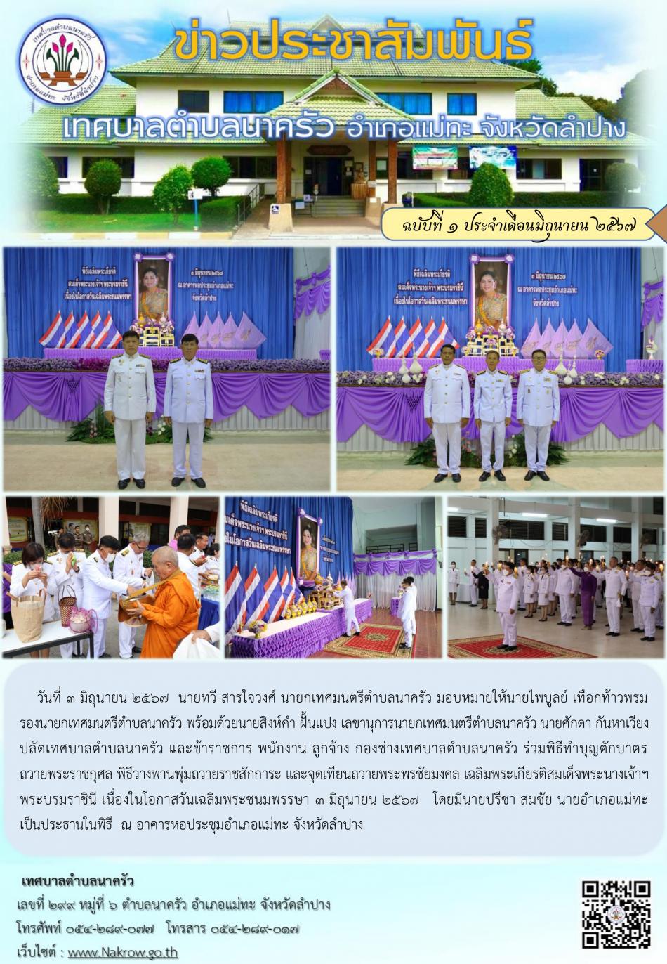 เทศบาลตำบลนาครัวเข้าร่วมพิธีเฉลิมพระเกียรติสมเด็จพระนางเจ้าฯ พระบรมราชินี เนื่องในโอกาสวันเฉลิมพระชนมพรรษา 3 มิถุนายน 2567 ณ อาคารหอประชุมอำเภอแม่ทะ [3 มิถุนายน 2567]