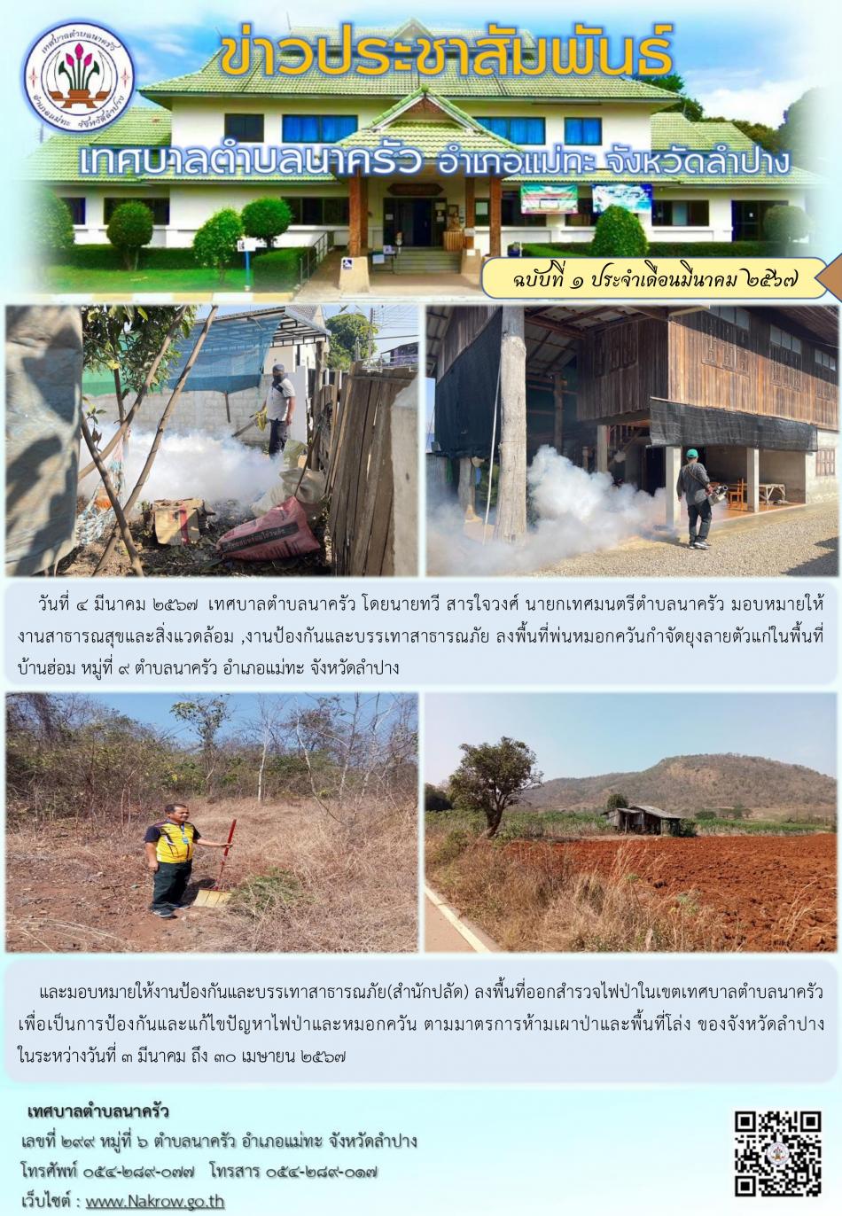 เทศบาลตำบลนาครัวลงพื้นที่พ่นหมอกควันกำจัดยุงลายตัวแก่ในพื้นที่บ้านฮ่อม หมู่ที่ 9 และลงพื้นที่ออกสำรวจไฟป่าในเขตเทศบาลตำบลนาครัว [4 มีนาคม 2567]