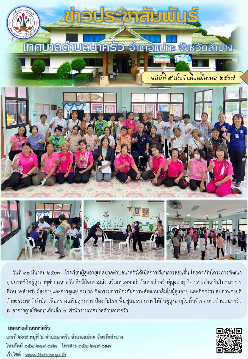 โครงการพัฒนาคุณภาพชีวิตผู้สูงอายุตำบลนาครัว ซึ่งมีกิจกรรมส่งเสริมการออกกำลังกายสำหรับผู้สูงอายุตำบลนาครัว [12 มีนาคม 2567]