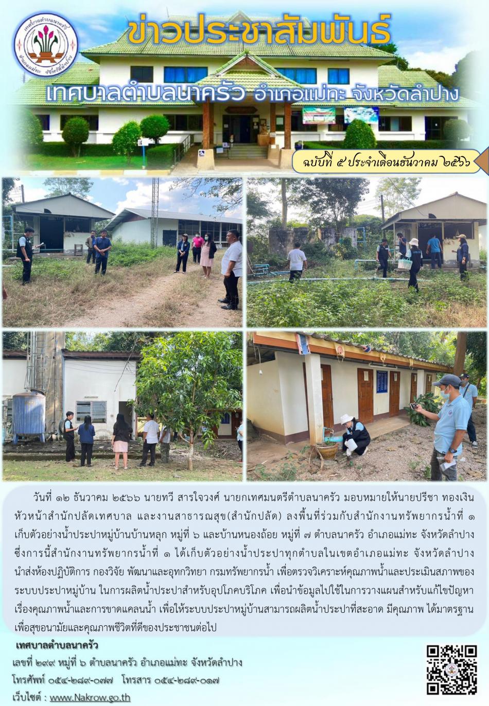 เทศบาลตำบลนาครัวลงพื้นที่ร่วมกับสำนักงานทรัพยากรน้ำที่ 1เก็บตัวอย่างน้ำประปาหมู่บ้านบ้านหลุก หมู่ที่ 6 และบ้านหนองถ้อย หมู่ที่ 7 ตำบลนาครัว อำเภอแม่ทะ จังหวัดลำปาง... [12 ธันวาคม 2566]