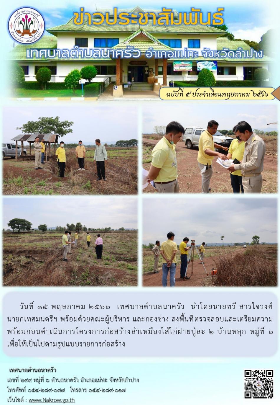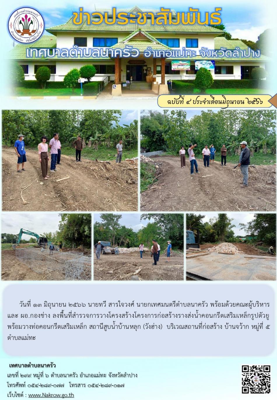 ายกเทศมนตรีตำบลนาครัว พร้อมด้วยคณะผู้บริหาร และ ผอ.กองช่างลงพื้นที่สำรวจการวางโครงสร้างโครงการก่อสร้างรางส่งน้ำคอนกรีตเสริมเหล็กรูปตัวยู พร้อมวางท่อคอนกรีตเสริมเหล็ก สถานีสูบน้ำบ้านหลุก (วังฮ่าง) [13 มิถุนายน 2566]