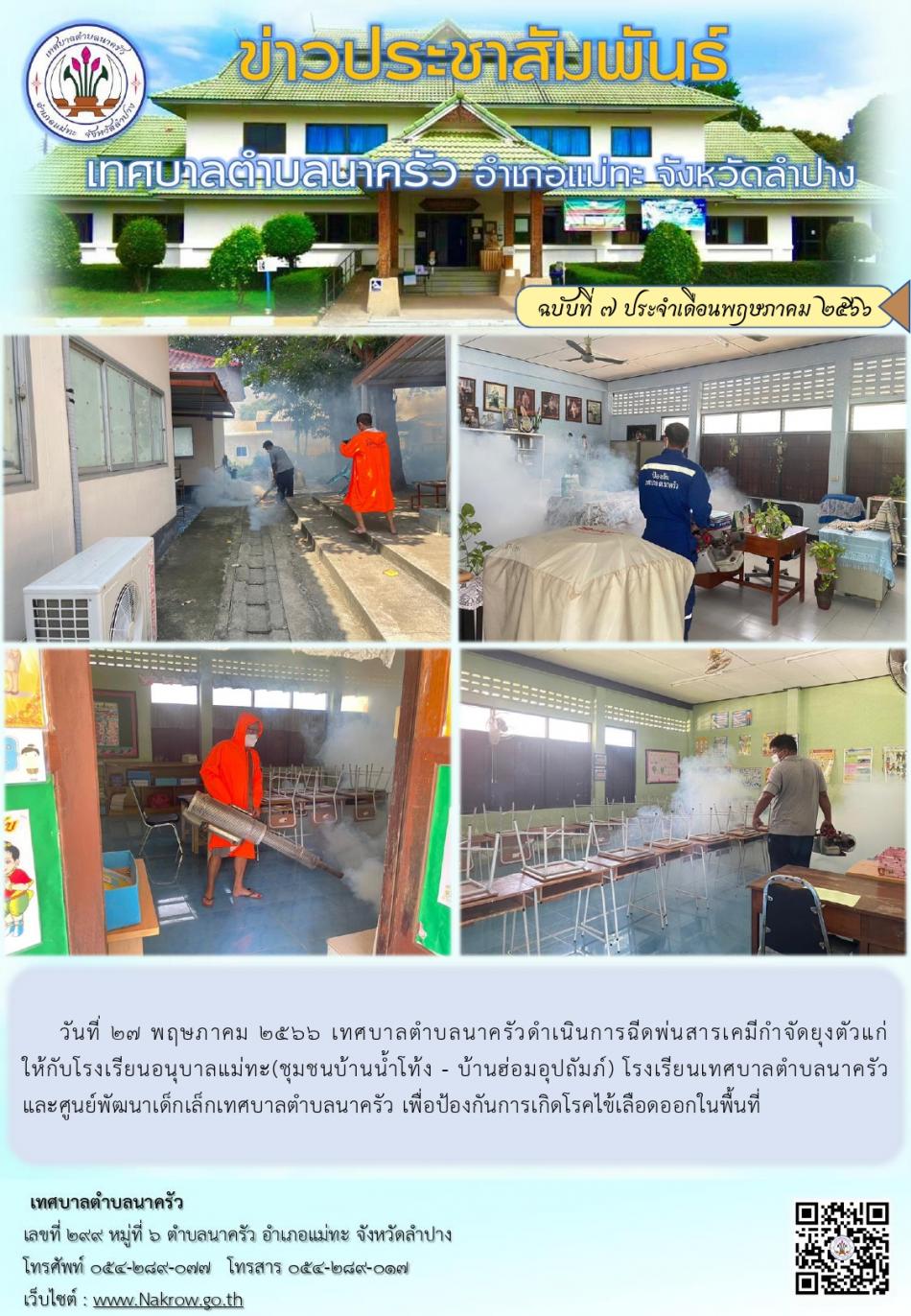 เทศบาลตำบลนาครัวดำเนินการฉีดพ่นสารเคมีกำจัดยุงตัวแก่ ให้กับโรงเรียนเพื่อป้องกันการเกิดโรคไข้เลือดออกในพื้นที่ [29 พฤษภาคม 2566]