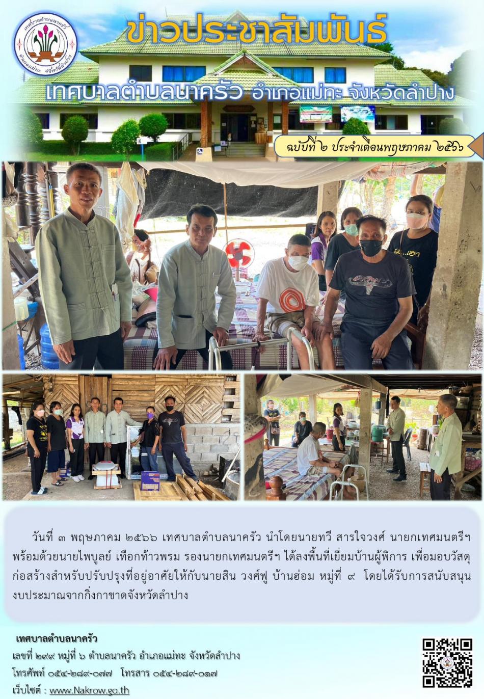 นายทวี สารใจวงศ์ นายกเทศมนตรีฯ พร้อมด้วยนายไพบูลย์ เทือกท้าวพรม รองนายกเทศมนตรีฯ ลงพื้นที่เยี่ยมบ้านผู้พิการ เพื่อมอบวัสดุก่อสร้างสำหรับปรับปรุงที่อยู่อาศัย [3 พฤษภาคม 2566]