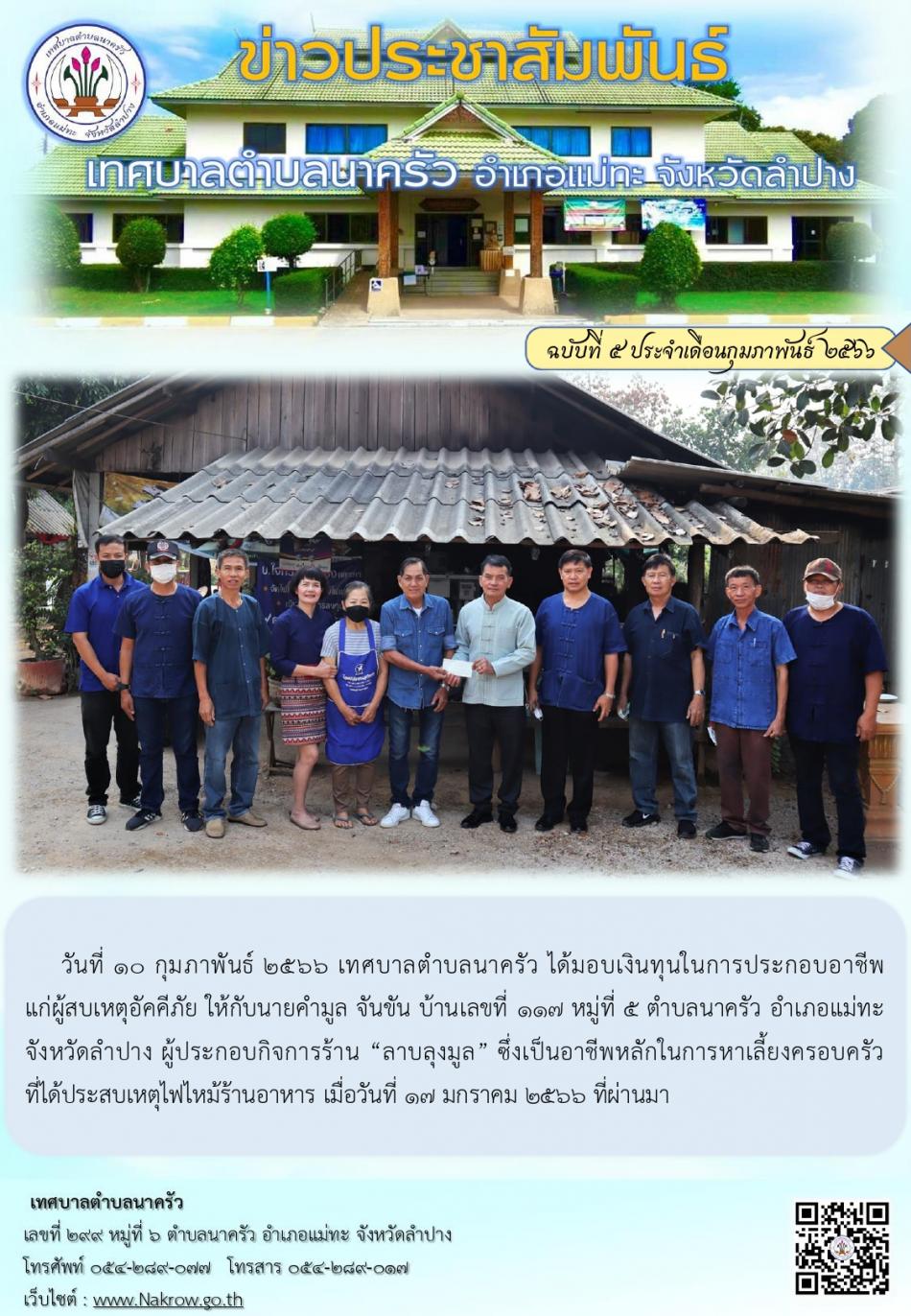 เทศบาลตำบลนาครัว ได้มอบเงินทุนในการประกอบอาชีพแก่ผู้สบเหตุไฟไหม้ร้านอาหาร เมื่อวันที่ 17 มกราคม 2566 ที่ผ่านมา [10 กุมภาพันธ์ 2566]