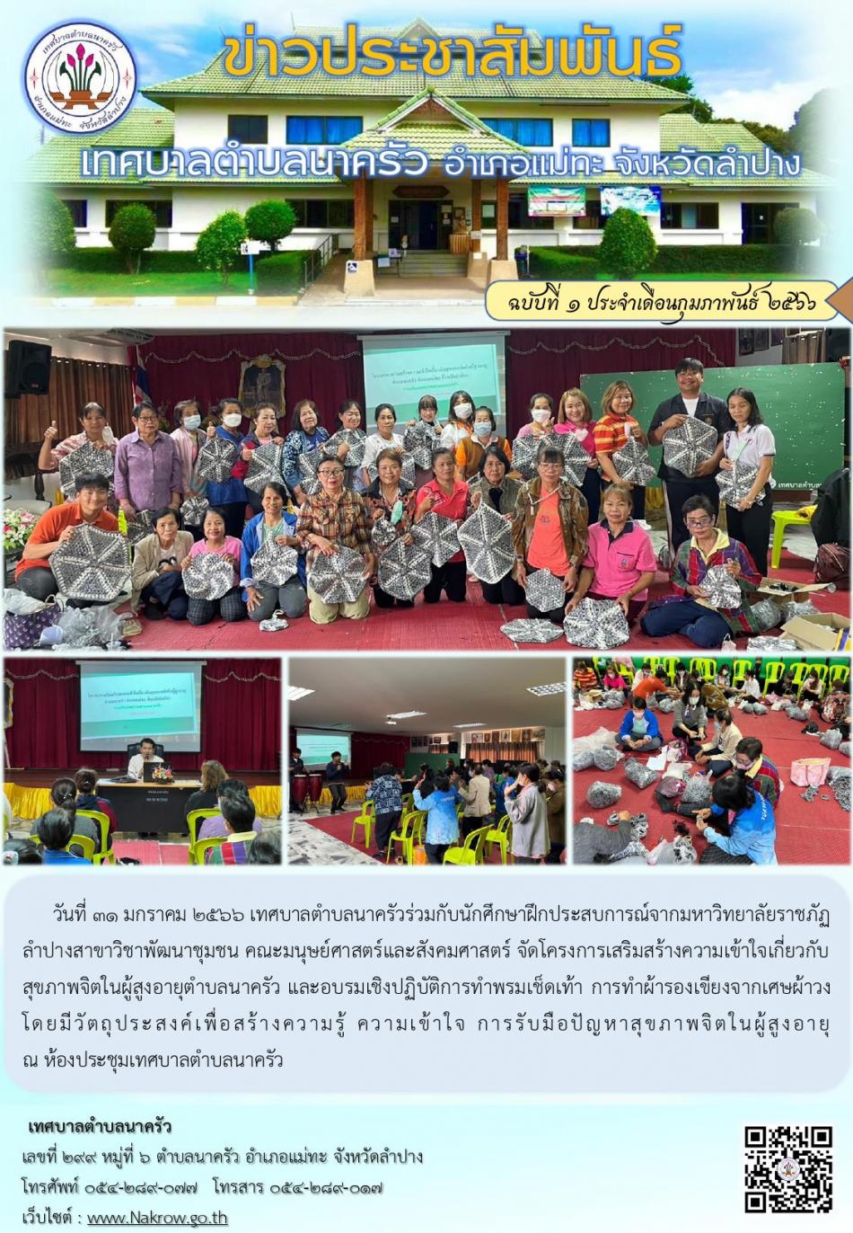 โครงการเสริมสร้างความเข้าใจเกี่ยวกับสุขภาพจิตในผู้สูงอายุตำบลนาครัว และอบรมเชิงปฏิบัติการทำพรมเช็ดเท้า การทำผ้ารองเขียงจากเศษผ้าวง [1 กุมภาพันธ์ 2566]