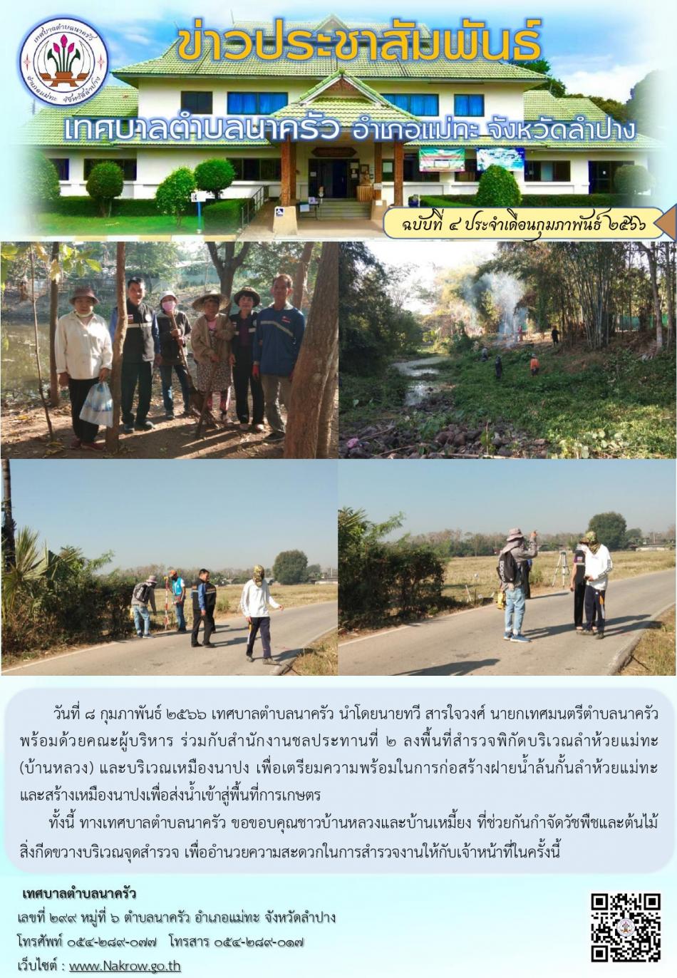 นายทวี สารใจวงศ์ นายกเทศมนตรีตำบลนาครัว ร่วมกับสำนักงานชลประทานที่ 2 ลงพื้นที่สำรวจพิกัดบริเวณลำห้วยแม่ทะ(บ้านหลวง) และบริเวณเหมืองนาปง เพื่อเตรียมความพร้อมในการก่อสร้างฝายน้ำล้นกั้นลำห้วยแม่ทะ... [9 กุมภาพันธ์ 2566]