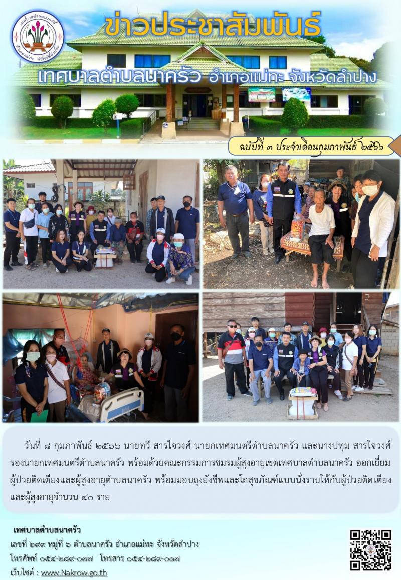 เทศบาลตำบลนาครัว พร้อมด้วยคณะกรรมการชมรมผู้สูงอายุเขตเทศบาลตำบลนาครัว ออกเยี่ยมผู้ป่วยติดเตียงและผู้สูงอายุ พร้อมมอบถุงยังชีพและโถสุขภัณฑ์แบบนั่งราบให้กับผู้ป่วยติดเตียงและผู้สูงอายุตำบลนาครัว จำนวน 40 ราย [8 กุมภาพันธ์ 2566]