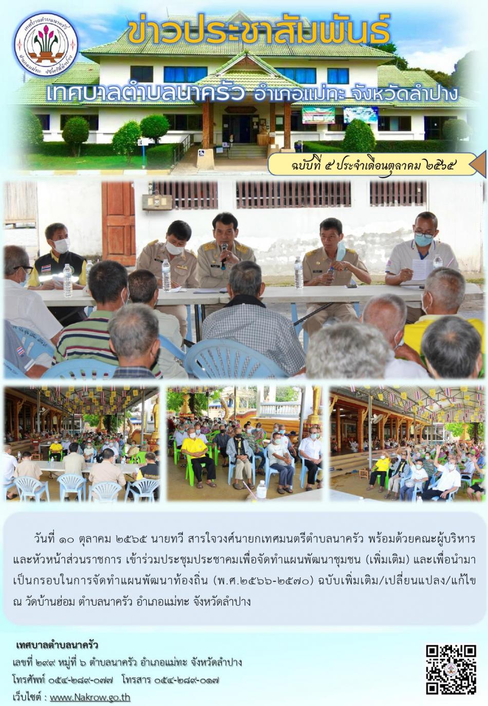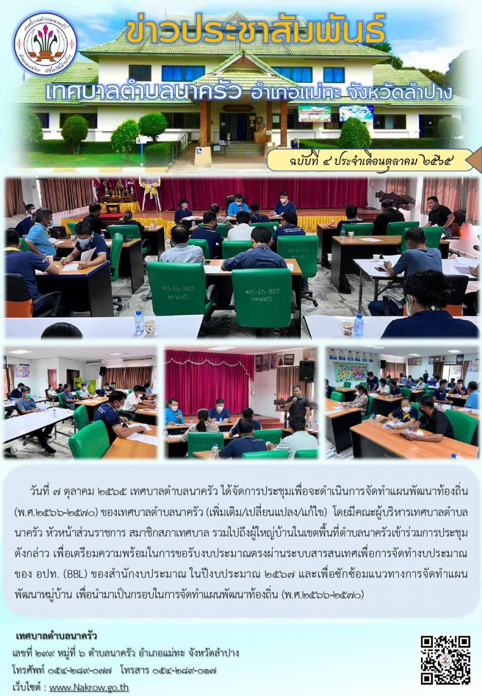 การประชุมเพื่อจะดำเนินการจัดทำแผนพัฒนาท้องถิ่น (พ.ศ.2566-2570) ของเทศบาลตำบลนาครัว (เพิ่มเติม/เปลี่ยนแปลง/แก้ไข) [7 ตุลาคม 2565]