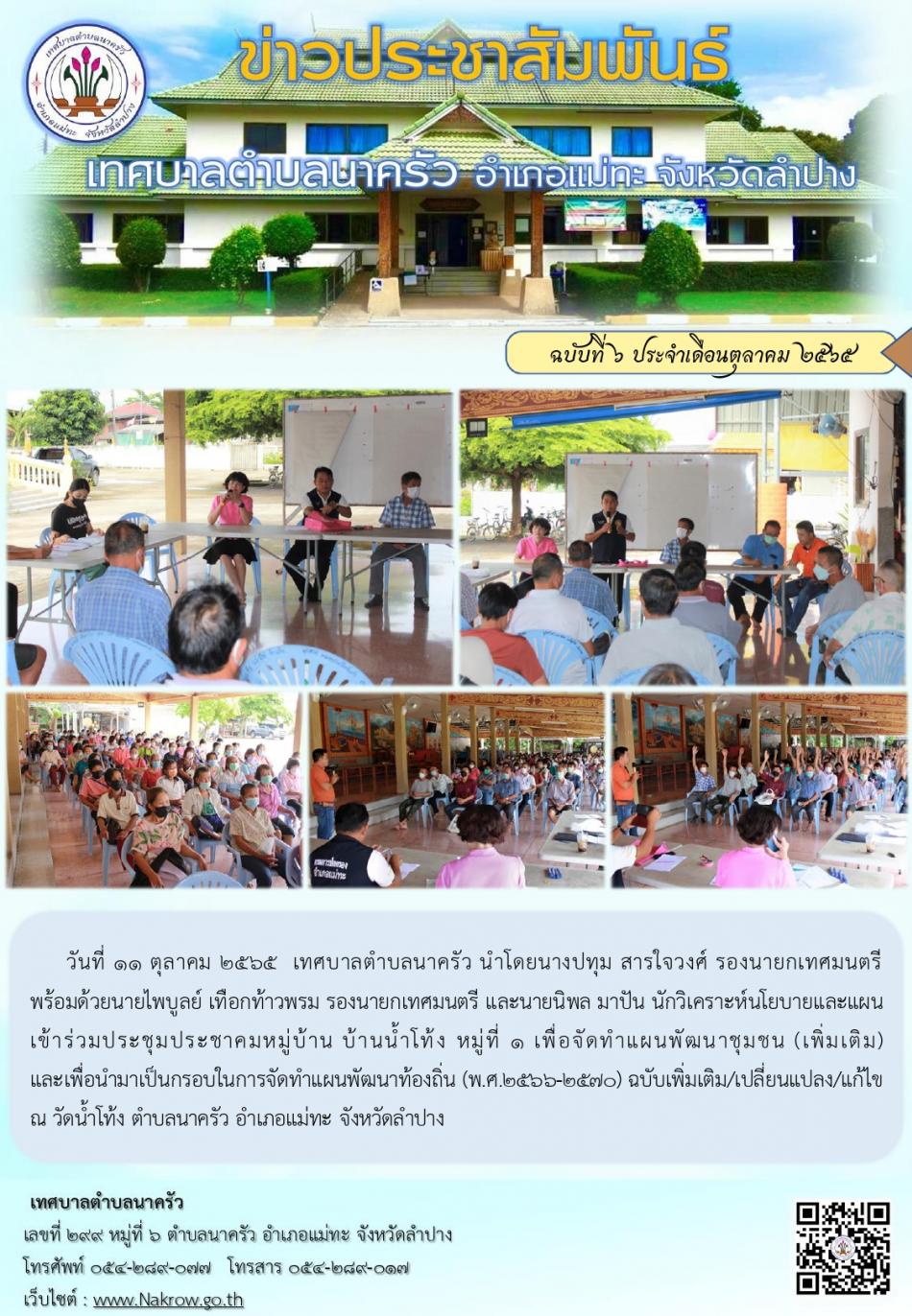 นายทวี สารใจวงศ์นายกเทศมนตรีตำบลนาครัว เข้าร่วมประชุมประชาคมเพื่อจัดทำแผนพัฒนาชุมชน (เพิ่มเติม) และเพื่อนำมาเป็นกรอบในการจัดทำแผนพัฒนาท้องถิ่น (พ.ศ.2566-2570) ฉบับเพิ่มเติม/เปลี่ยนแปลง/แก้ไข ณ วัดบ้านฮ่อม [10 ตุลาคม 2565]