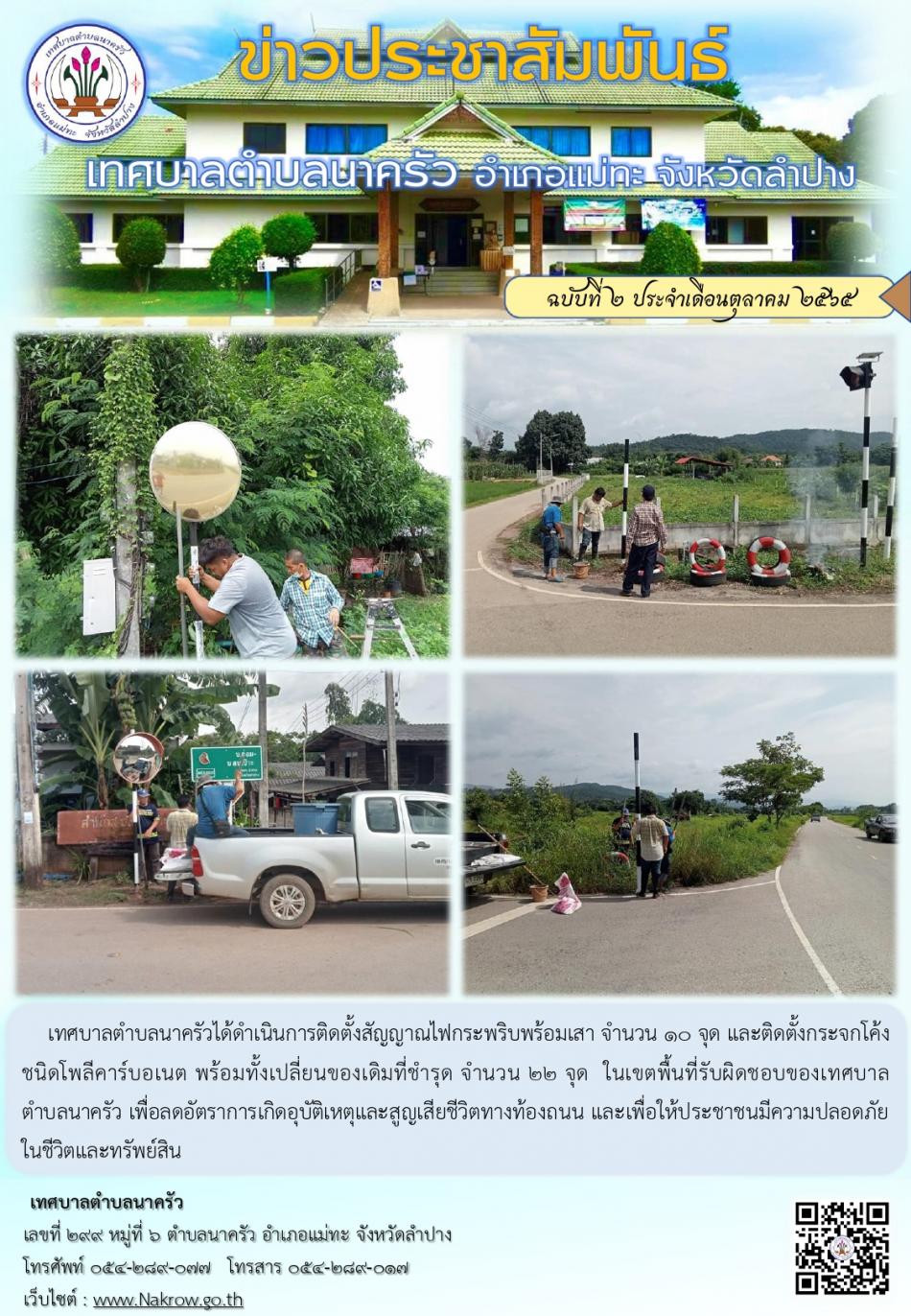 เทศบาลตำบลนาครัวได้ดำเนินการติดตั้งสัญญาณไฟกระพริบพร้อมเสา และติดตั้งกระจกโค้งชนิดโพลีคาร์บอเนต พร้อมทั้งเปลี่ยนของเดิมที่ชำรุด [3 ตุลาคม 2565]