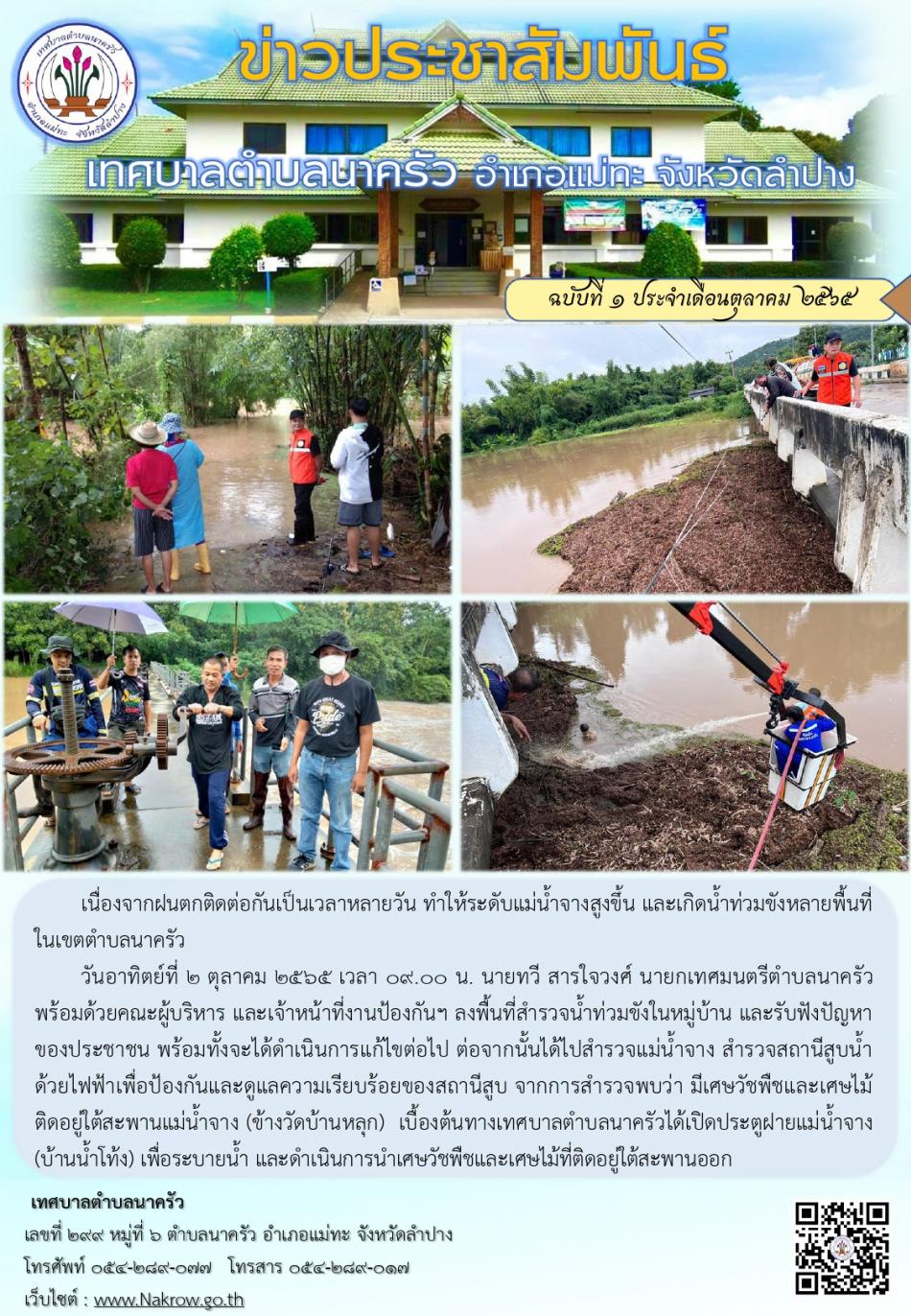 นายทวี สารใจวงศ์ นายกเทศมนตรีตำบลนาครัว พร้อมด้วยคณะผู้บริหาร และเจ้าหน้าที่งานป้องกันฯ ลงพื้นที่สำรวจน้ำท่วมขังในหมู่บ้าน และสำรวจแม่นำจาง [3 ตุลาคม 2565]