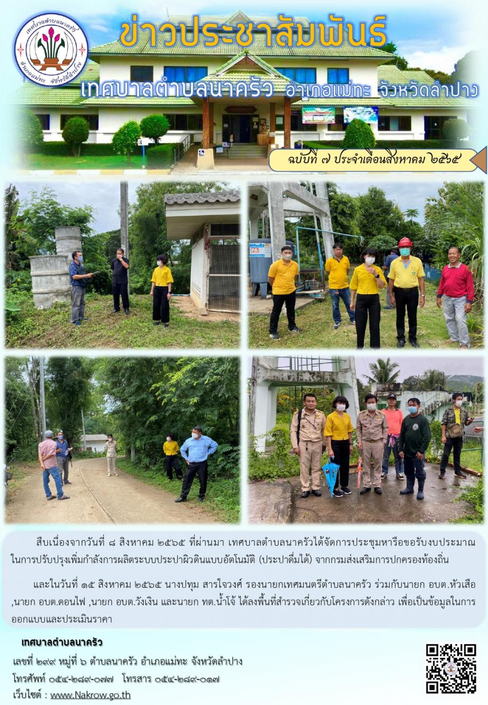 นางปทุม สารใจวงศ์ รองนายกเทศมนตรีตำบลนาครัว ร่วมกับนายกองค์กรปกครองส่วนท้องถิ่น ได้ลงพื้นที่สำรวจเกี่ยวกับโครงการปรับปรุงเพิ่มกำลังการผลิตระบบประปาผิวดินแบบอัตโนมัติ (ประปาดื่มได้) [16 สิงหาคม 2565]