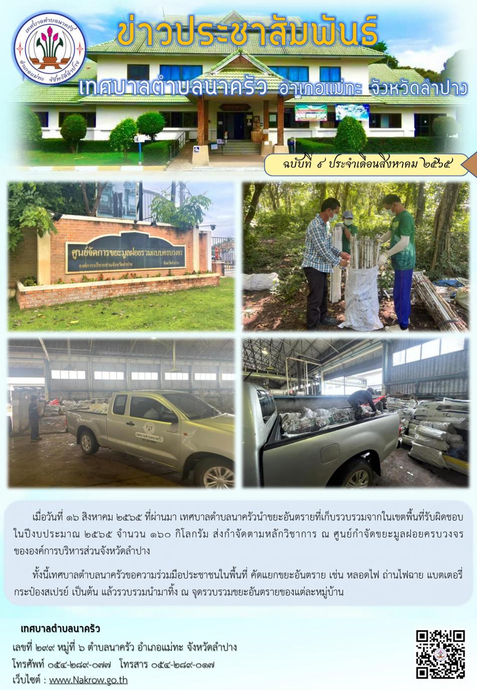 เทศบาลตำบลนาครัวนำขยะอันตรายที่เก็บรวบรวมจากในเขตพื้นที่รับผิดชอบ ในปีงบประมาณ 2565 ส่งกำจัดตามหลักวิชาการ ณ ศูนย์กำจัดขยะมูลฝอยครบวงจรขององค์การบริหารส่วนจังหวัดลำปาง [19 สิงหาคม 2565]