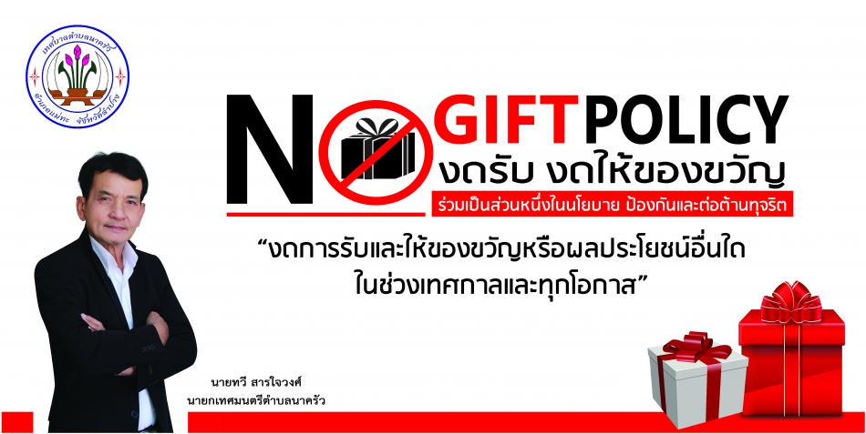เทศบาลตำบลนาครัว ประกาศตนเป็นหน่วยงานที่ผู้บริหาร พนักงาน เจ้าหน้าที่และบุคลากรในสังกัดทุกคนไม่รับของขวัญและของกำนัลทุกชนิดจากการปฏิบัติหน้าที่ (No Gift Policy)ทุกวาระเทศกาลและโอกาสพิเศษต่าง ๆ [4 มีนาคม 2565]