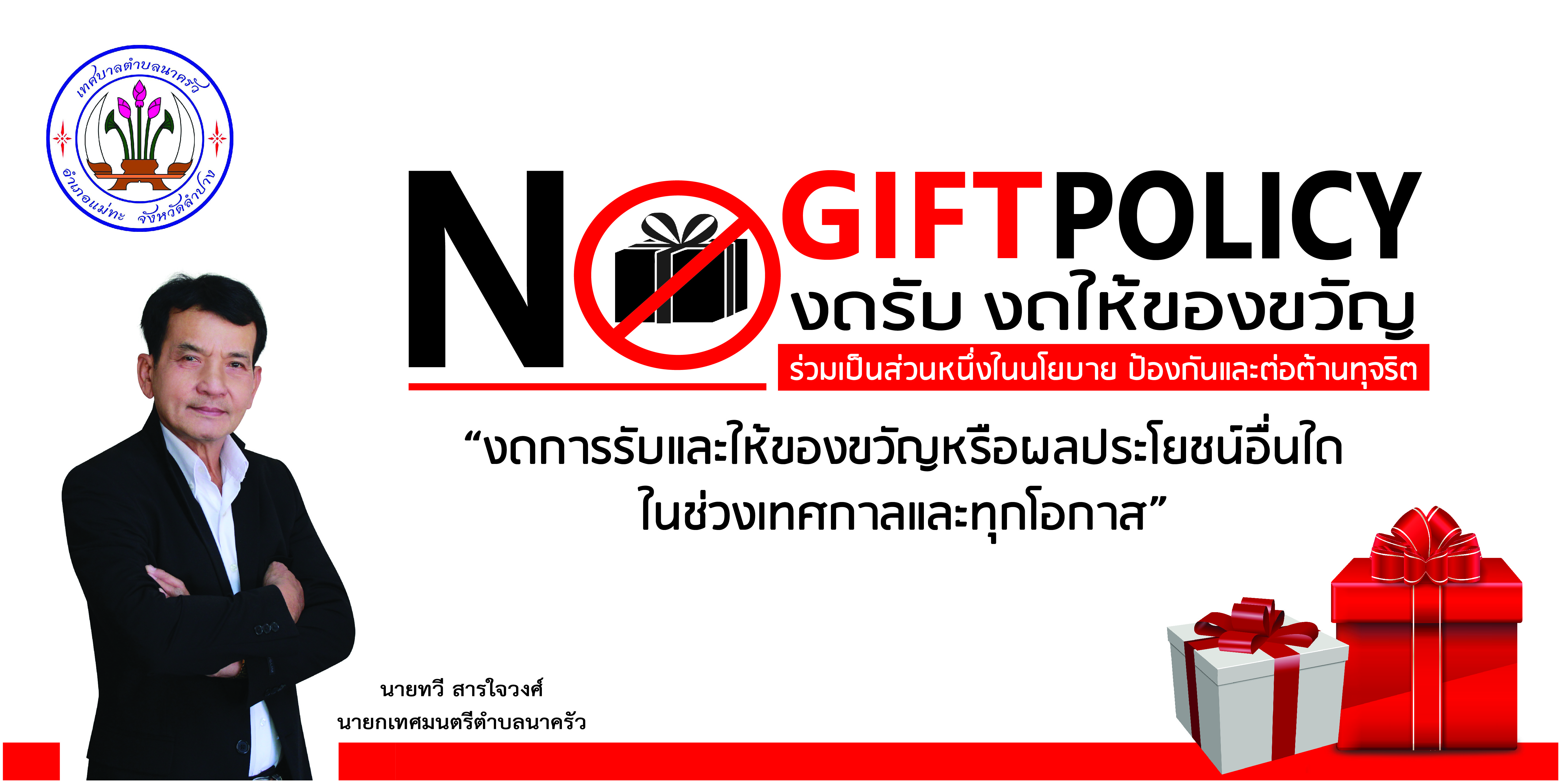 ชื่อเรื่อง : เทศบาลตำบลนาครัว ประกาศตนเป็นหน่วยงานที่ผู้บริหาร พนักงาน เจ้าหน้าที่และบุคลากรในสังกัดทุกคนไม่รับของขวัญและของกำนัลทุกชนิดจากการปฏิบัติหน้าที่ (No Gift Policy)ทุกวาระเทศกาลและโอกาสพิเศษต่าง ๆ