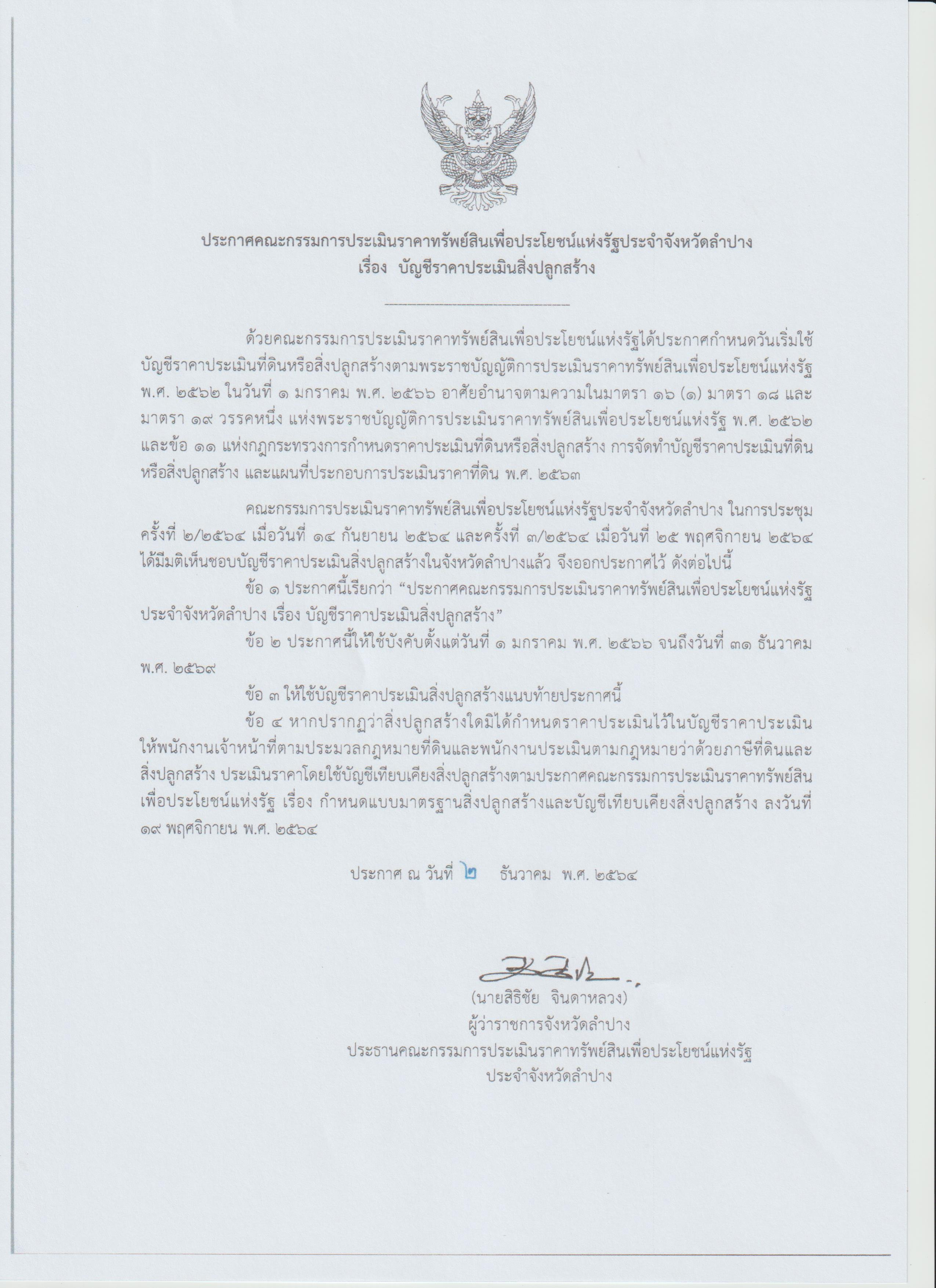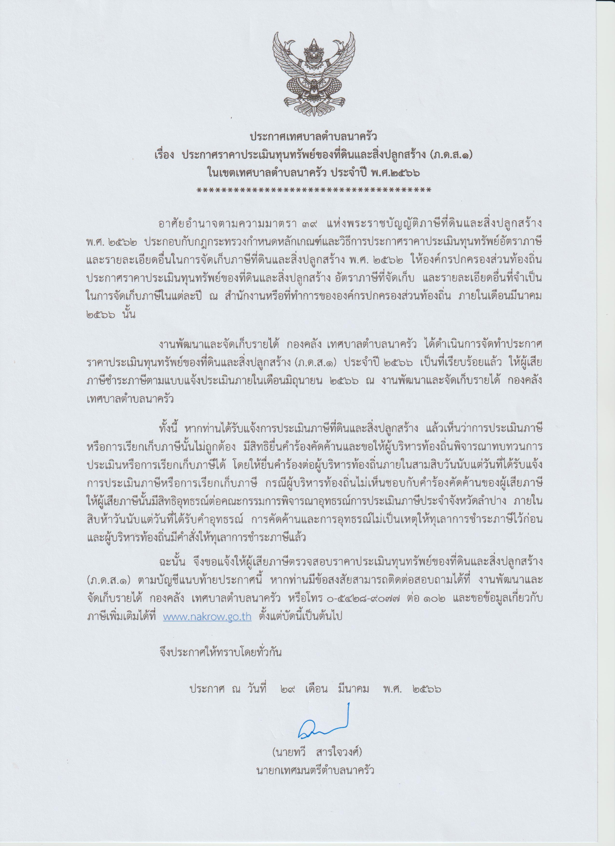 ประกาศราคาประเมินทุนทรัพย์ของที่ดินและสิ่งปลูกสร้าง ในเขตเทศบาลตำบลนาครัว ประจำปีพ.ศ. 2566