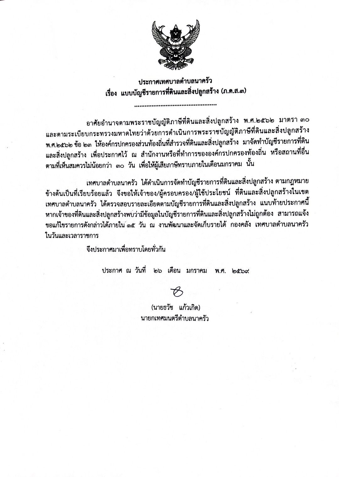 ประกาศเทศบาลตำบลนาครัว เรื่อง แบบบัญชีรายการที่ดินและสิ่งปลูกสร้าง (ภ.ด.ส.3) ประจำปี พ.ศ.2569