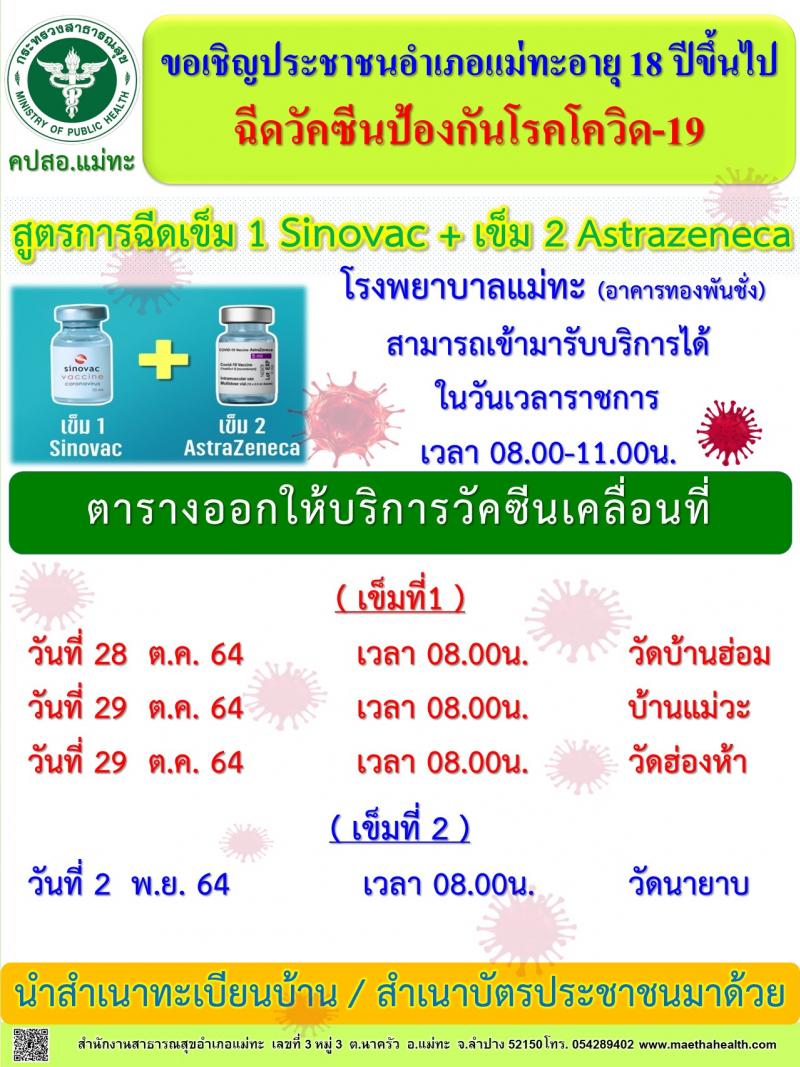รายละเอียด : เทศบาลตำบลนาครัวร่วมกับโรงพยาบาลส่งเสริมสุขภาพตำบลบ้านอ้วนและทีม อสม.ในพื้นที่จัดกิจกรรมรณรงค์ให้ประชาชนเข้ารับการฉีดวัคซีนป้องกันโรคโควิด19 ตามตารางออกให้บริการวัคซีนเคลื่อนที่ สำหรับในพื้นที่ตำบลนาครัวสามารถเข้ารับบริการได้ที่วัดบ้านฮ่อม ในวันที่ 28 ตุลาคม 2564 เวลา 08.00น. เป็นต้นไป