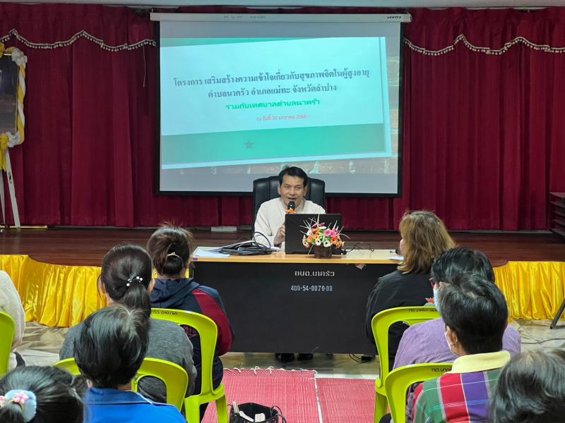 รายละเอียด : วันที่ 31 มกราคม 2566 เทศบาลตำบลนาครัวร่วมกับนักศึกษาฝึกประสบการณ์จากมหาวิทยาลัยราชภัฏลำปางสาขาวิชาพัฒนาชุมชน คณะมนุษย์ศาสตร์และสังคมศาสตร์ จัดโครงการเสริมสร้างความเข้าใจเกี่ยวกับสุขภาพจิตในผู้สูงอายุตำบลนาครัว และอบรมเชิงปฏิบัติการทำพรมเช็ดเท้า การทำผ้ารองเขียงจากเศษผ้าวง โดยมีวัตถุประสงค์เพื่อสร้างความรู้ ความเข้าใจ การรับมือปัญหาสุขภาพจิตในผู้สูงอายุ ณ ห้องประชุมเทศบาลตำบลนาครัว
