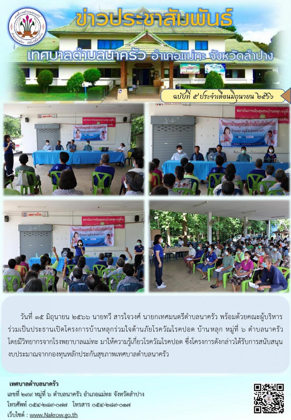นายทวี สารใจวงศ์ นายกเทศมนตรีตำบลนาครัว พร้อมด้วยคณะผู้บริหาร ร่วมเป็นประธานเปิดโครงการบ้านหลุกร่วมใจต้านภัยโรควัณโรคปอด บ้านหลุก หมู่ที่ 6 [15 มิถุนายน 2566]