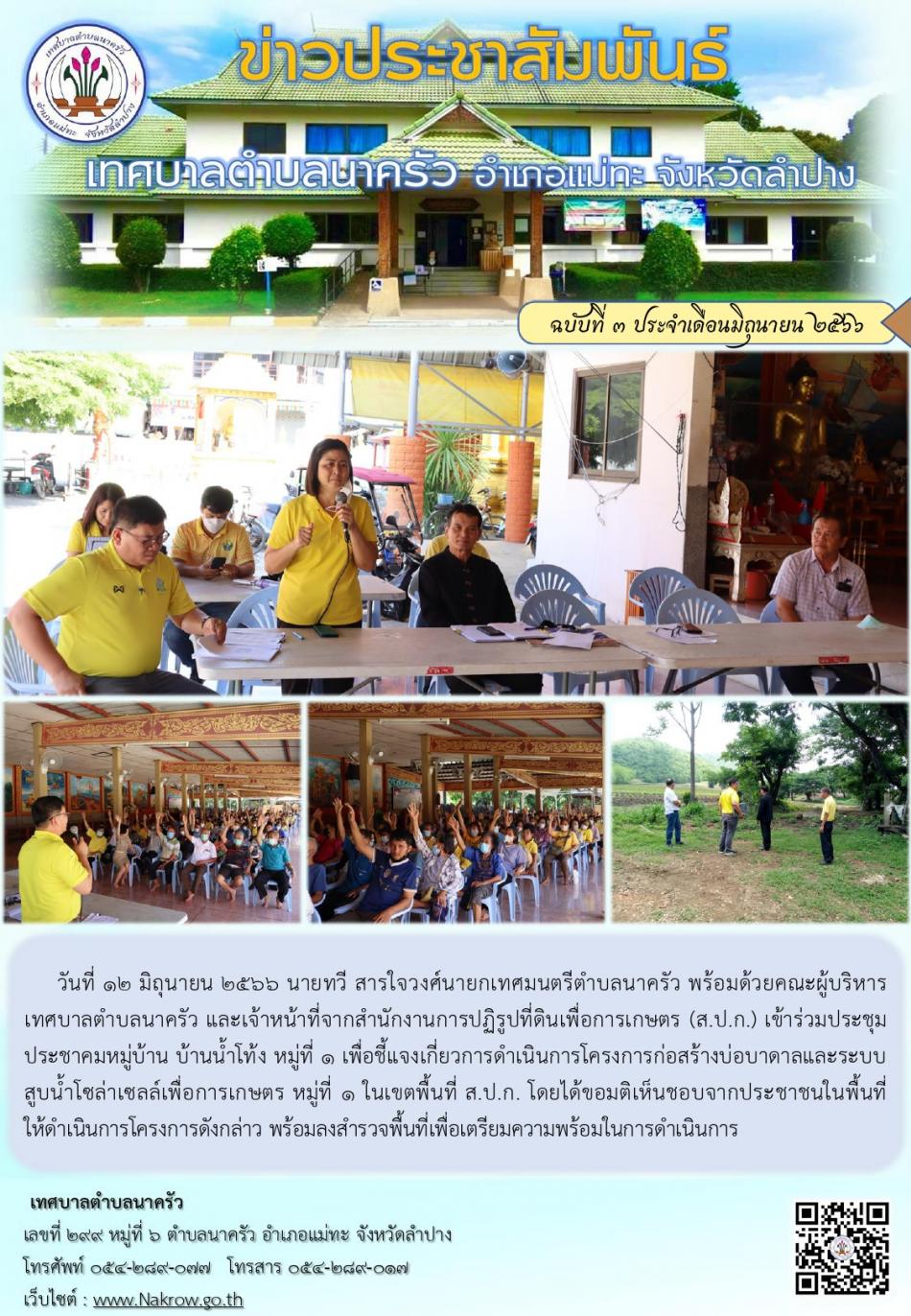 ประชุมประชาคมหมู่บ้าน บ้านน้ำโท้ง หมู่ที่ 1 เพื่อชี้แจงเกี่ยวการดำเนินการโครงการก่อสร้างบ่อบาดาลและระบบ สูบน้ำโซล่าเซลล์เพื่อการเกษตร หมู่ที่ 1 ในเขตพื้นที่ ส.ป.ก. [12 มิถุนายน 2566]