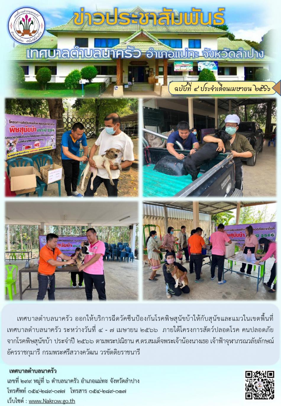 เทศบาลตำบลนาครัว ออกให้บริการฉีดวัคซีนป้องกันโรคพิษสุนัขบ้าให้กับสุนัขและแมวในเขตพื้นที่เทศบาลตำบลนาครัว ระหว่างวันที่ 4-7 เมษายน 2566 [7 เมษายน 2566]