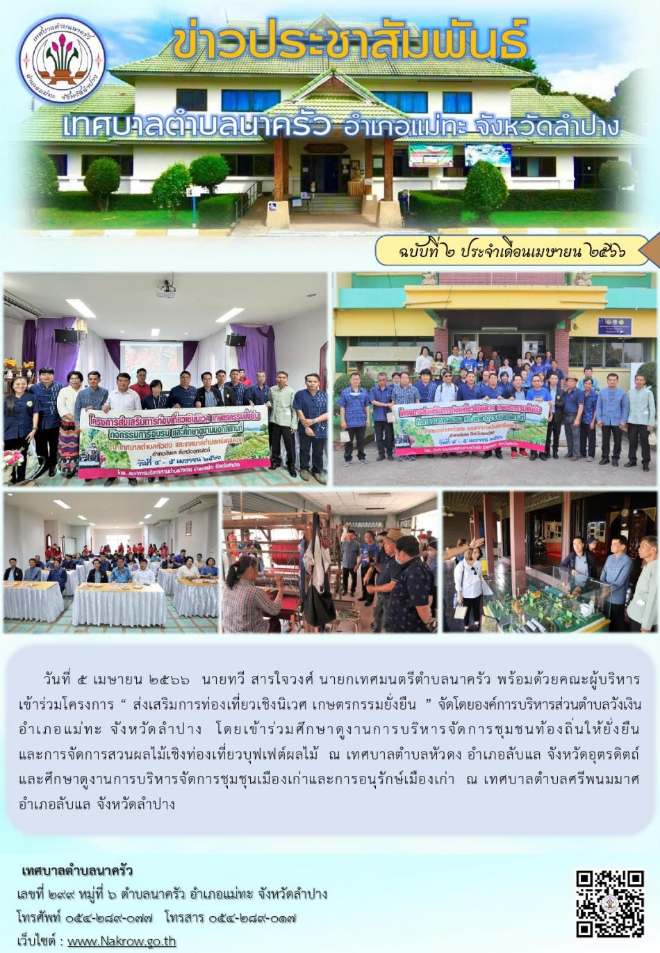 นายทวี สารใจวงศ์ นายกเทศมนตรีตำบลนาครัว ศึกษาดูงานการบริหารจัดการชุมชนท้องถิ่นให้ยั่งยืนและการจัดการสวนผลไม้เชิงท่องเที่ยวบุฟเฟต์ผลไม้ ณ เทศบาลตำบลหัวดง ... [5 เมษายน 2566]